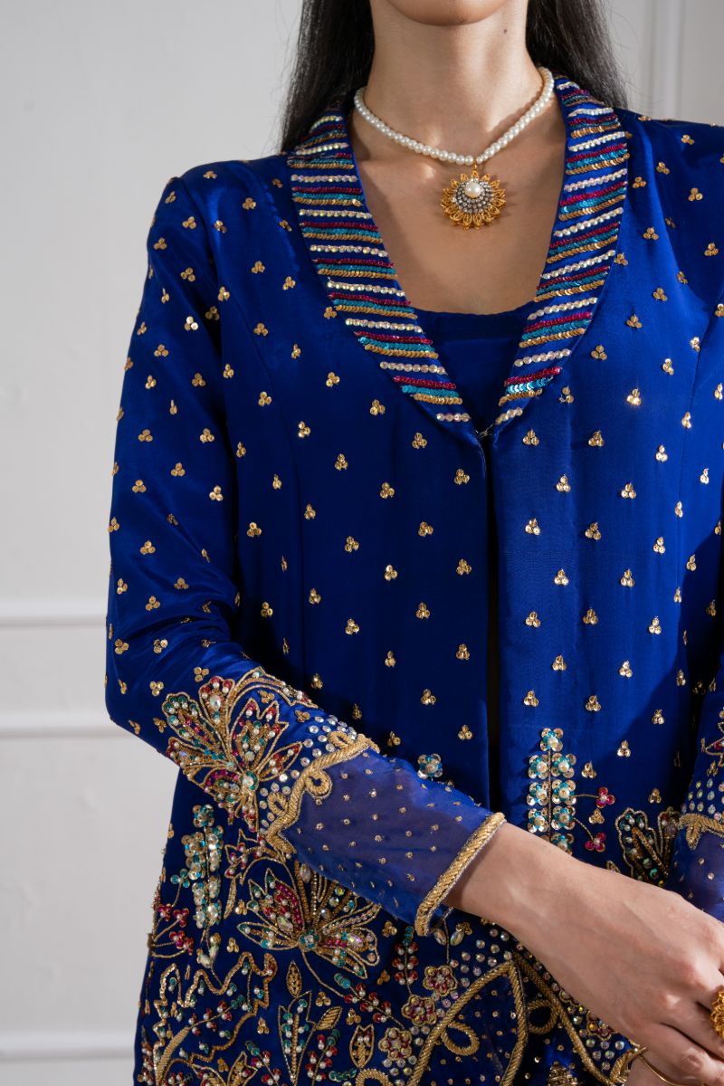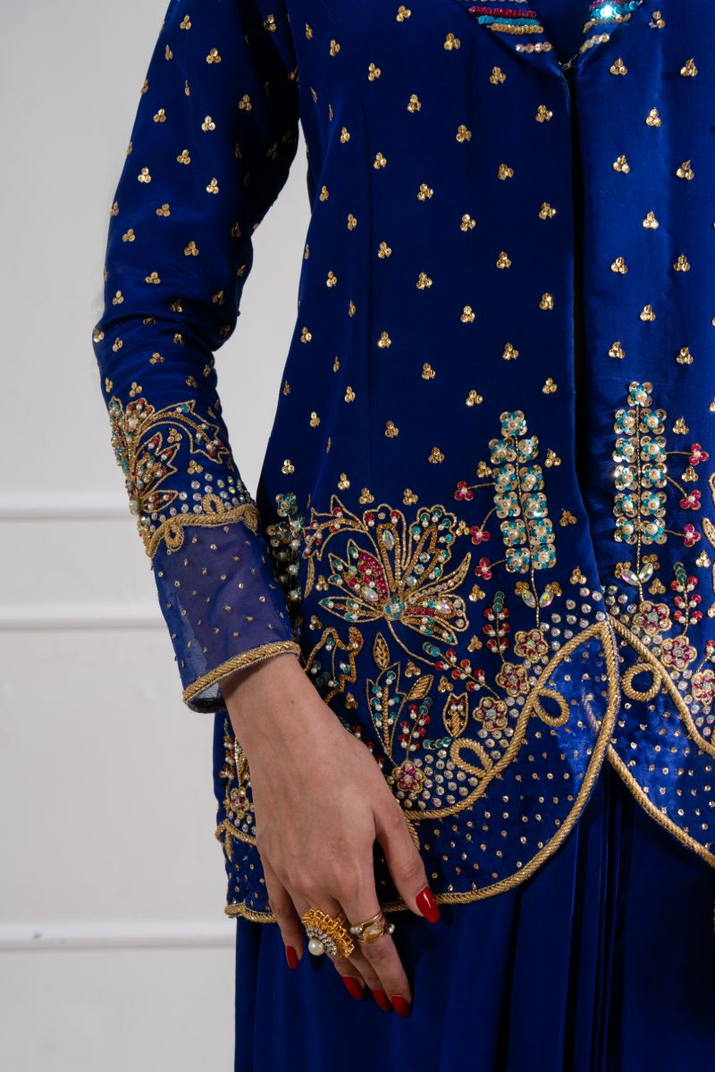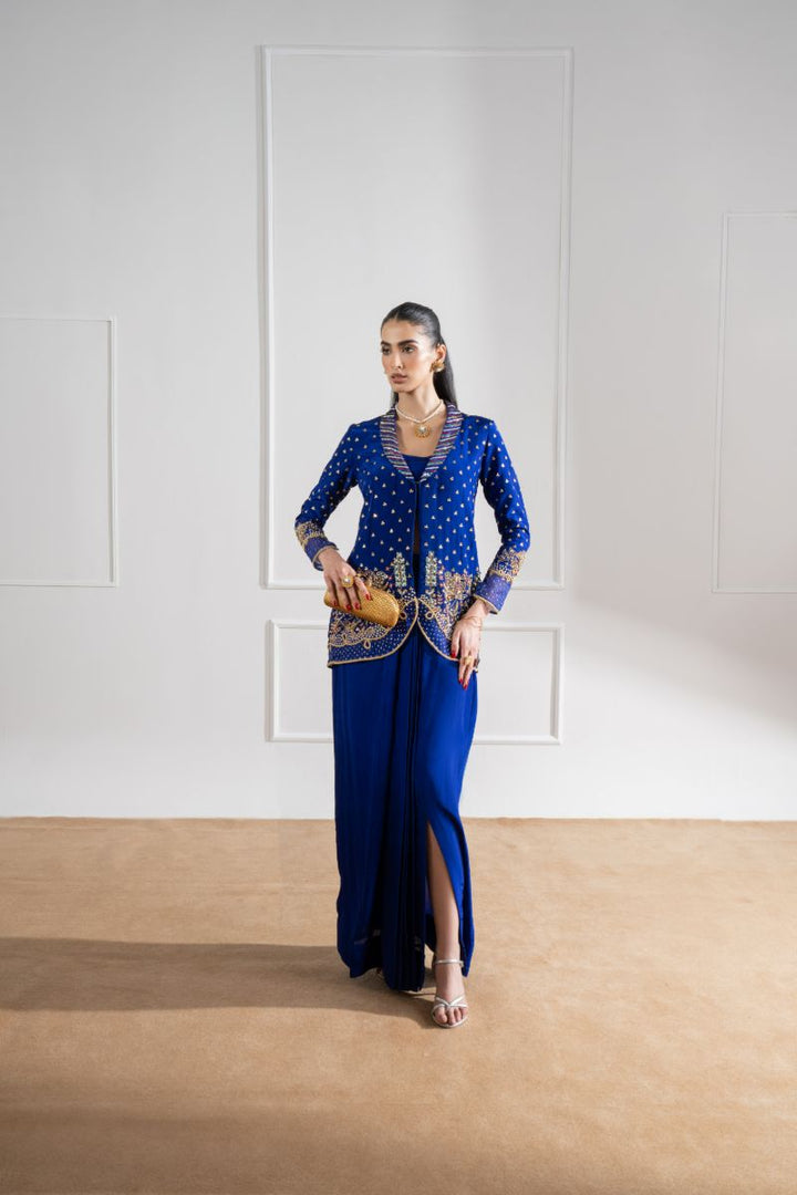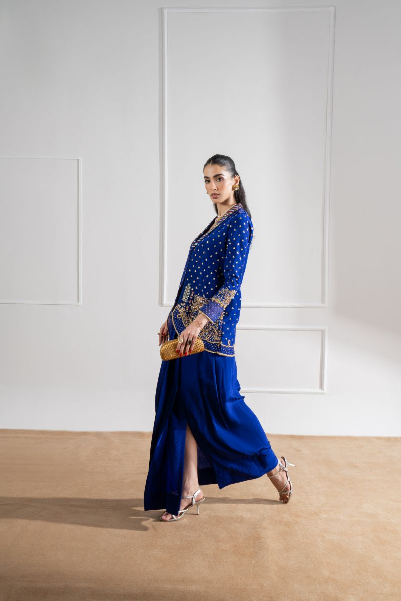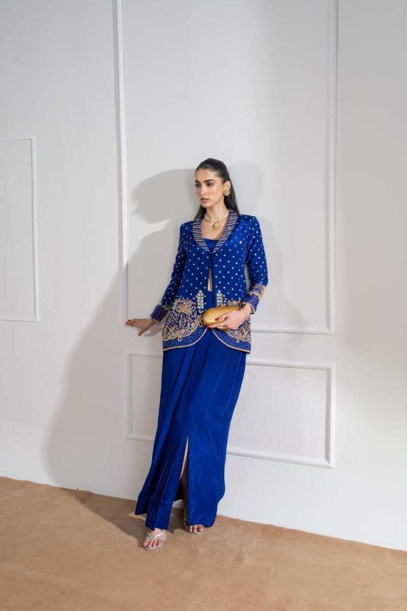 Fully hand embellished jacket with front slits open paired with drapped skirt.