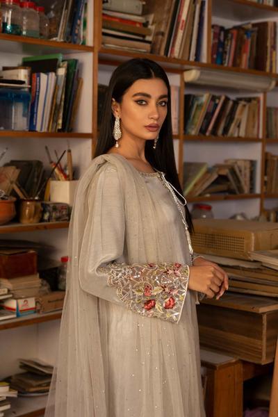 This flinty neutral is a simple swap for black. Not as deep in colour or intense, but it is every bit as practical. Accentuated with hints of green, crimson red and highlighted with silver tilla and sequins on sheer net, this ensemble is the epitome of feminity.