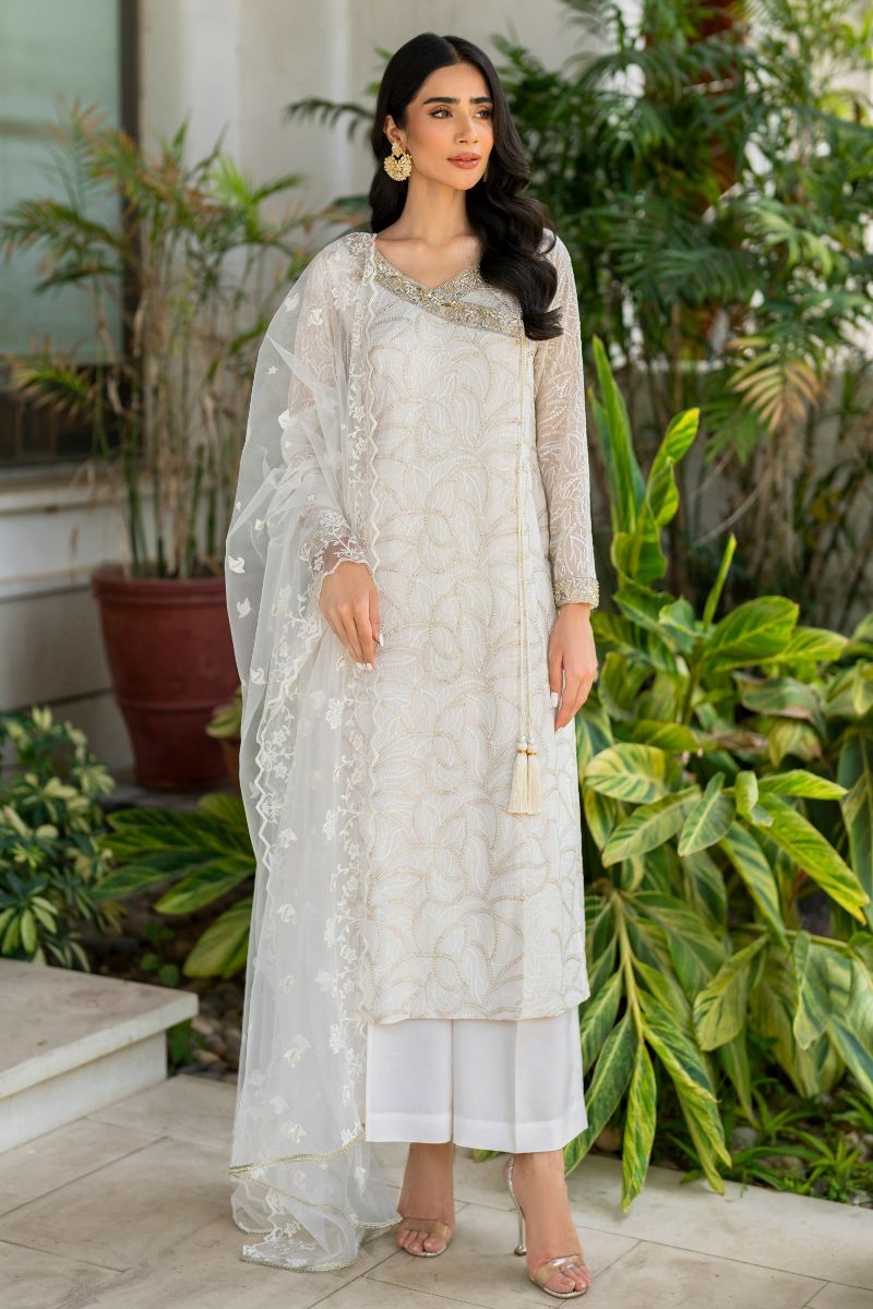 Composition Tunic: Net lined with crepe de chin Pants: Raw Silk Dupatta : Net with sequins embroidery Dry Clean Only light grey canvas with heavily adorned sequin work (three piece set) The perfect all season staple, feauting intricate sequinned embroidery on net, and pearl button detailing along the sleeves for a romantic look. Paired with a sheer dupatta and sequins , wide leg culottes for a polished edit.