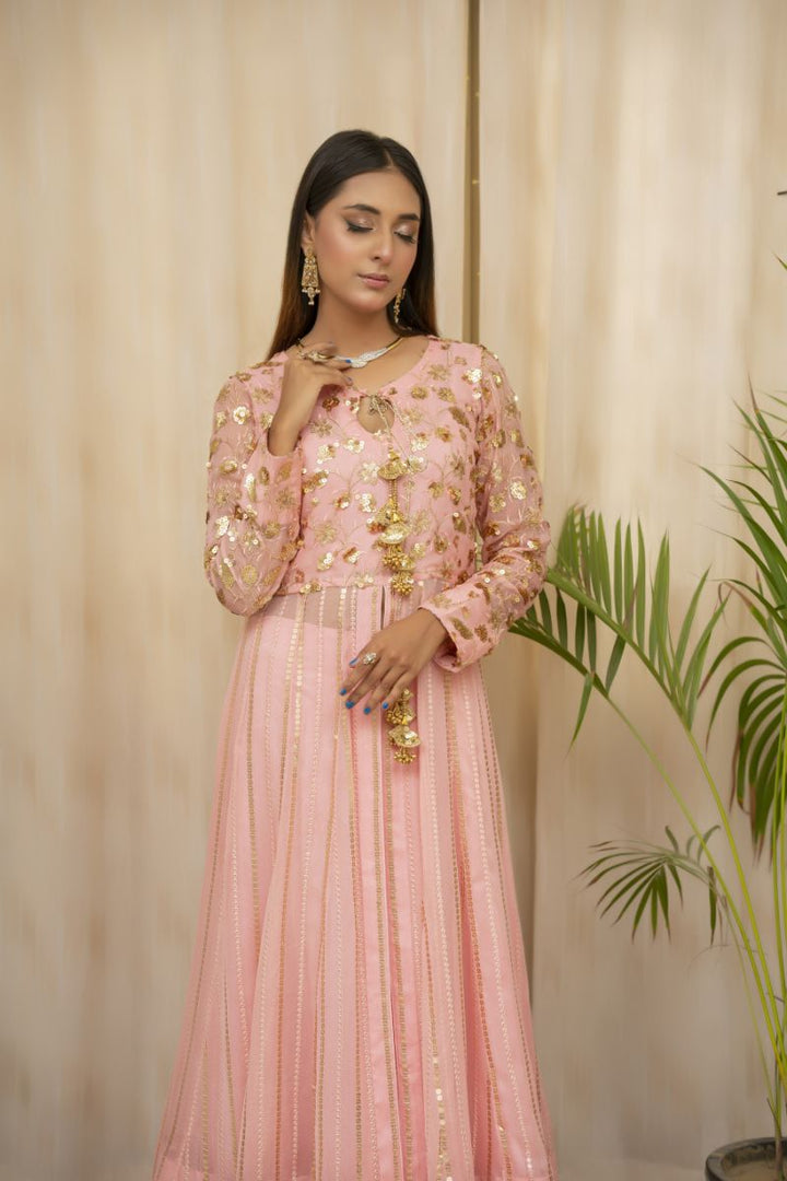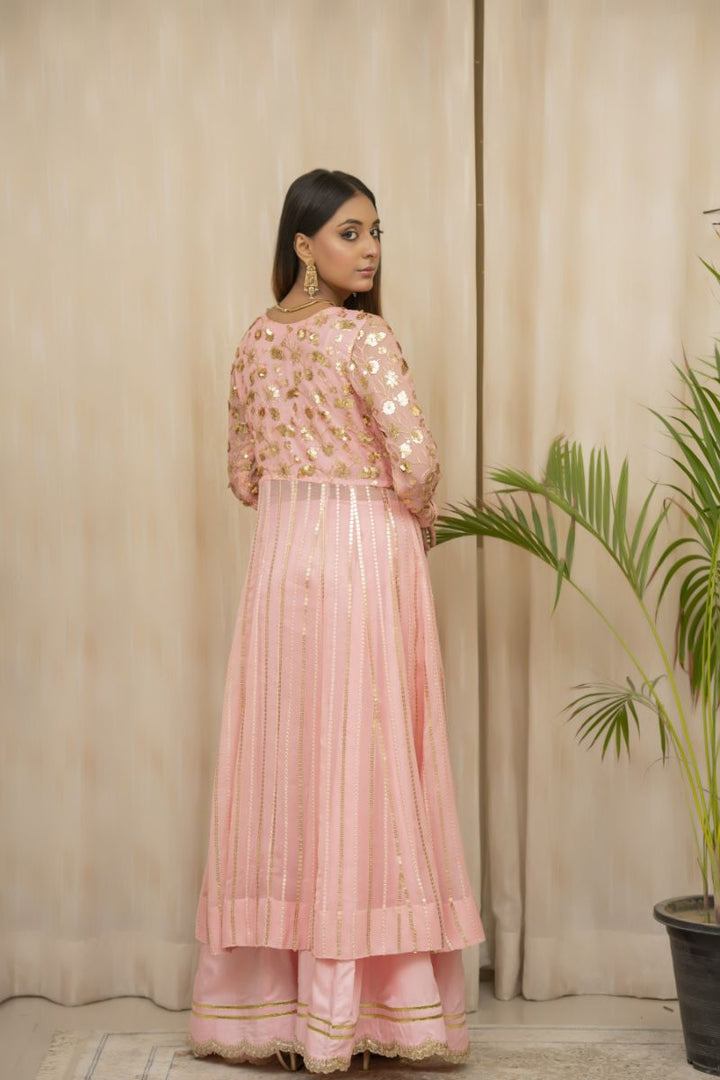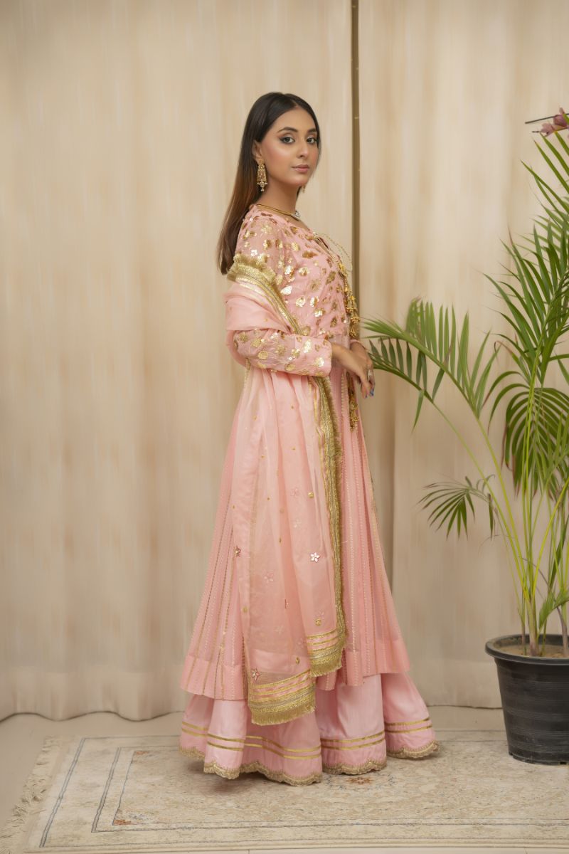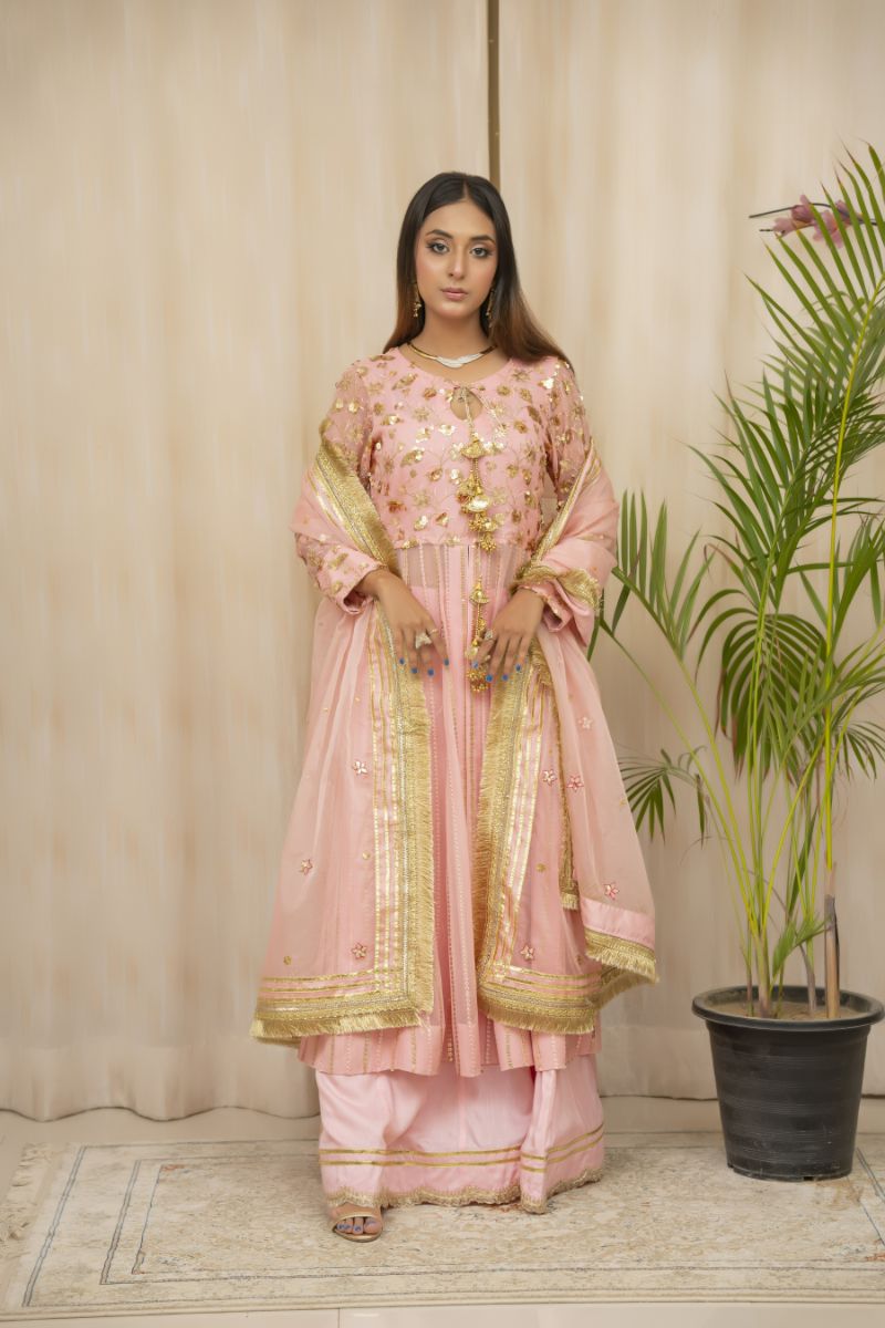 The set is completed with a luxurious viscose lehenga, adorned with intricate gota trims that enhance its elegance. The ensemble is bathed in a soft pink hue, reflecting a blend of tradition and contemporary style, making Asmira not just a garment, but a statement of grace and poise. Taking care of your clothes makes them pristine for a long time. This garment has been carefully hand crafted using the finest quality fabrics sourced from Pakistan.
