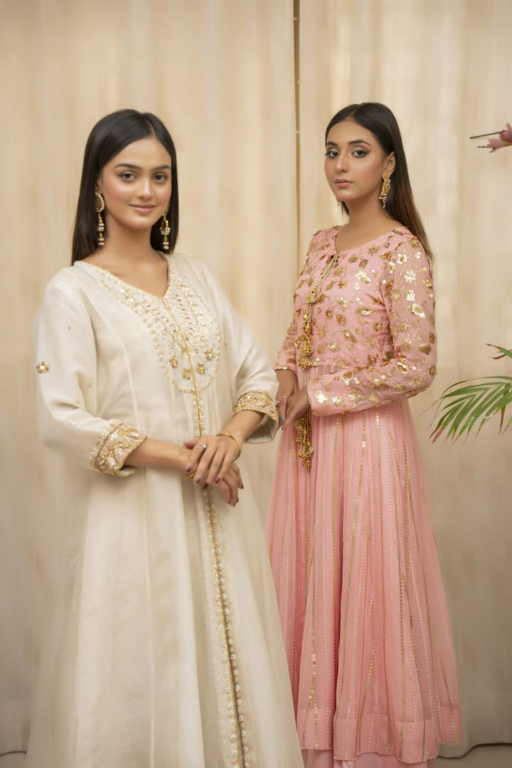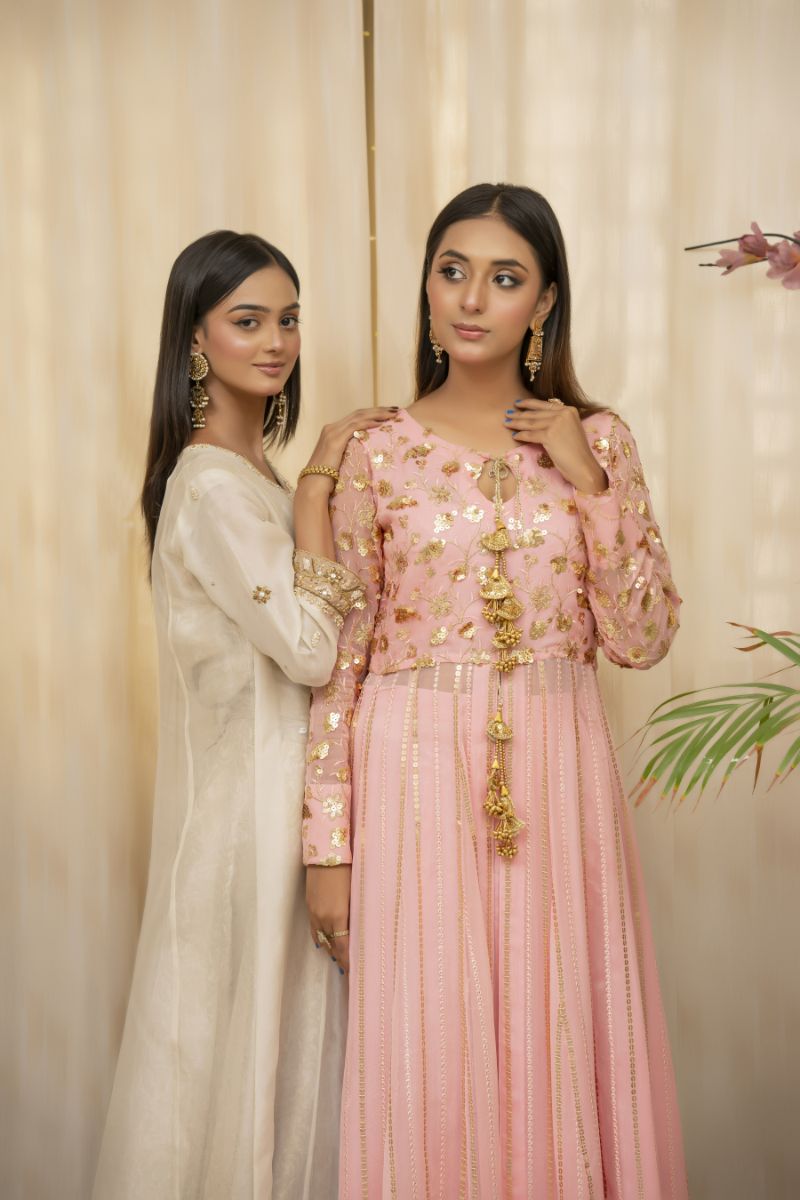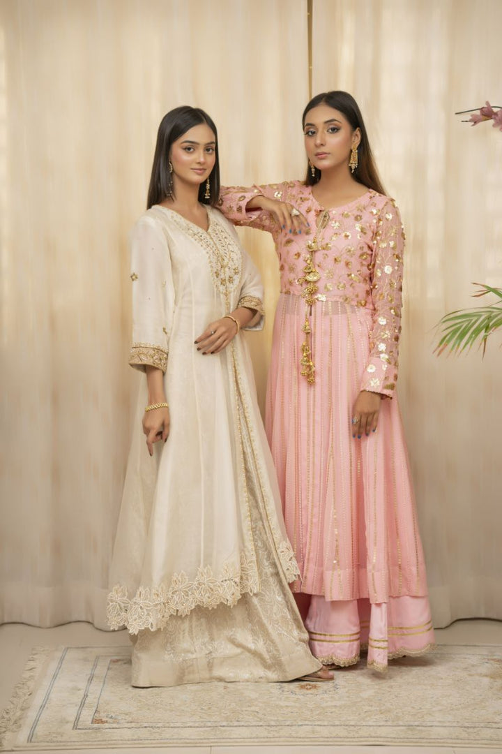 Asmira, a stunning ensemble that you can wear on formal event as well as parties. The centerpiece of this set is a long chiffon panel shirt. Paired with this is an organza dupatta, embellished to give a deluxe look. The gota work is exquisitely detailed on the organza dupatta, adding a shimmering finish that complements the overall design. The delicate embellishments add a touch of glamour.