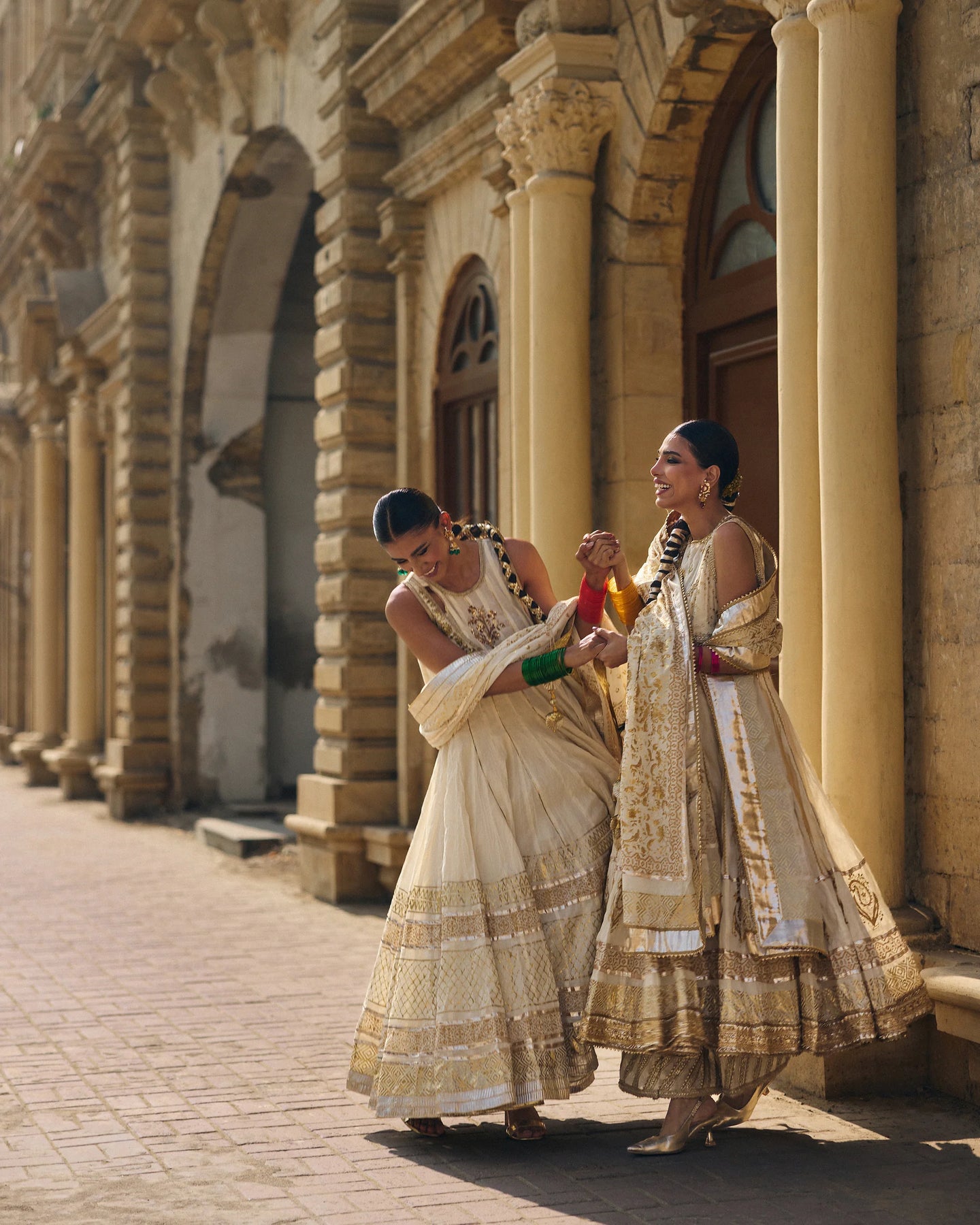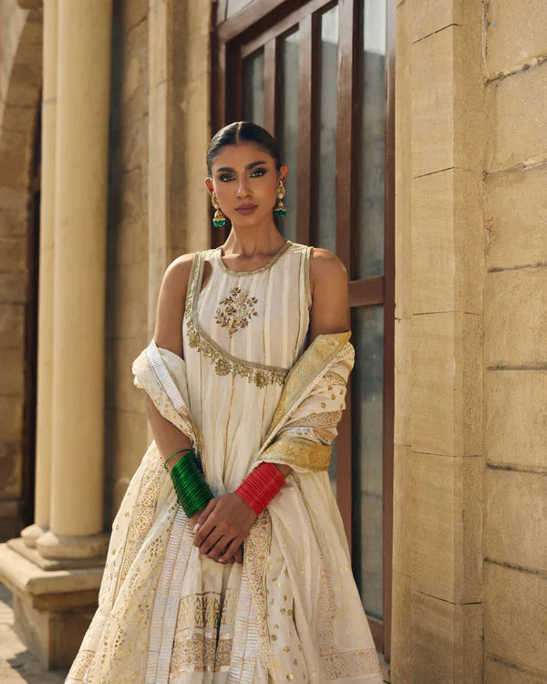 This three-piece ensemble is designed for festive and formal occasions, crafted with pure hand-woven muslin that adds a naturally rich and elegant feel to the outfit. The design features a blend of foil printing and traditional gold block printing, creating a beautifully regal look with soft, radiant detailing. The outfit is further adorned with heavy gota accents and delicate hand embellishments using sequins, adding subtle sparkle and depth. The overall appearance is richly crafted, luxurious, and timeless — a truly exquisite piece that is perfect for nikah ceremonies, weddings, and any celebration where you want to look effortlessly regal and refined.