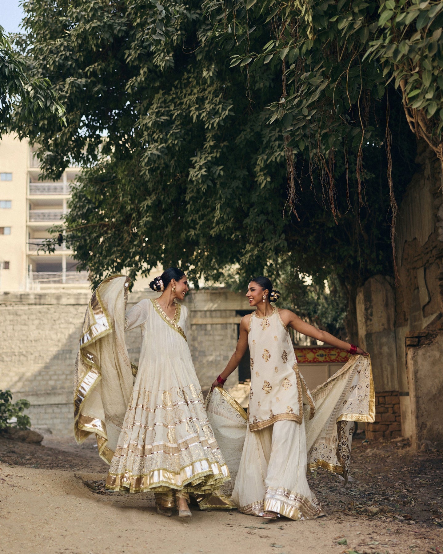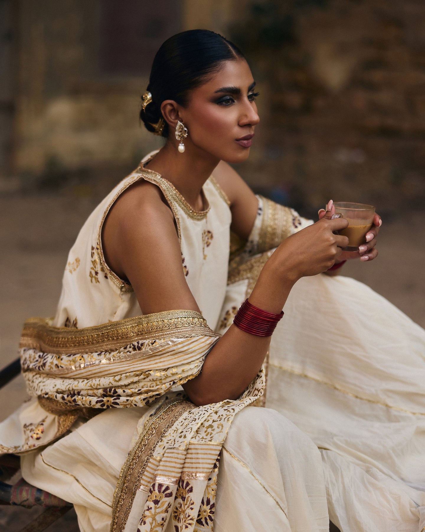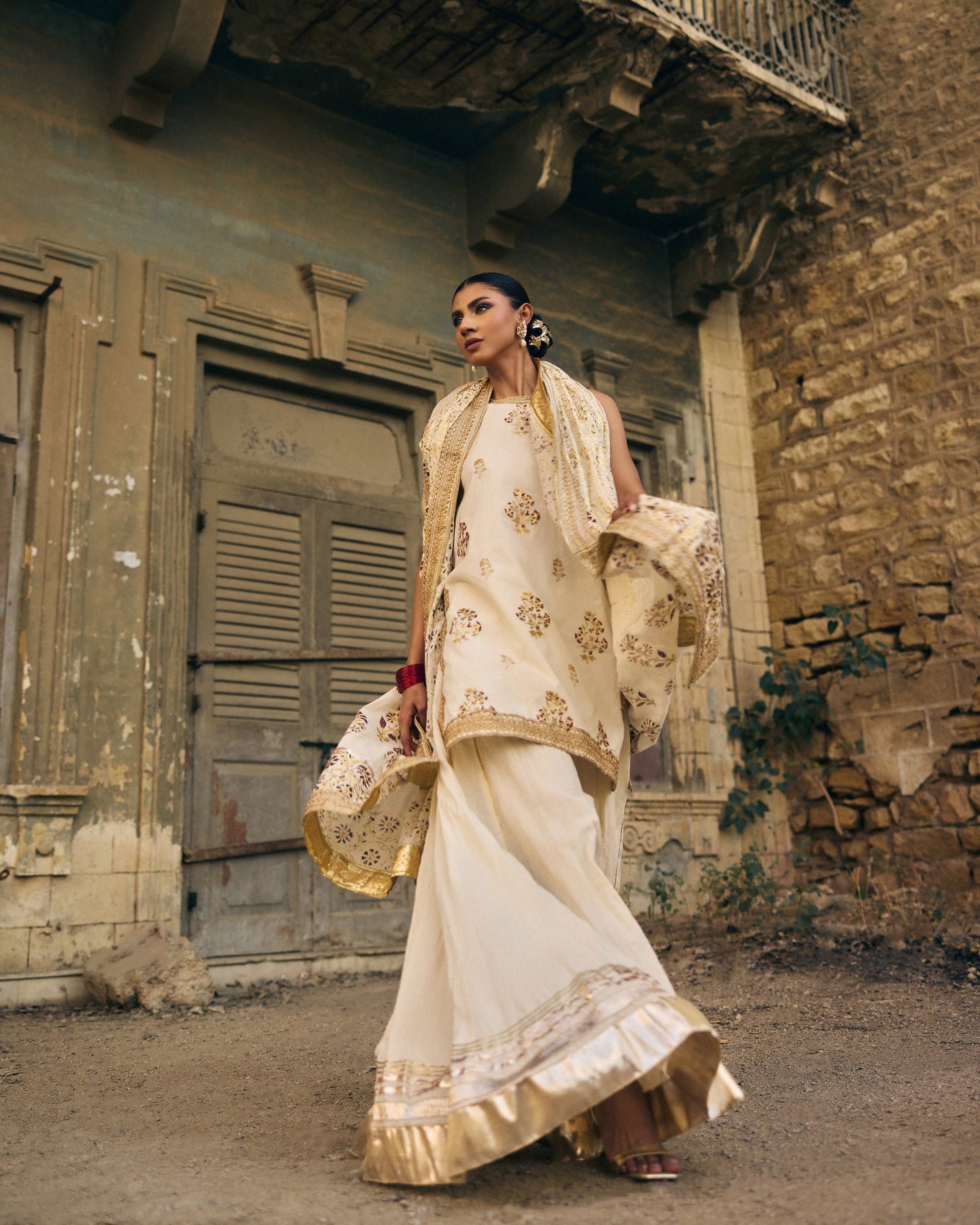 Pari is an elegant three-piece ensemble crafted from pure hand-woven muslin, blending traditional charm with a refined, graceful silhouette. The short shirt adds a modern, youthful touch, while the classic Dhaka pajama provides beautiful volume and movement, creating a look that is both festive and timeless. The centerpiece of this outfit is its heavy dupatta, richly finished to bring depth,, and a celebratory feel to the entire look. Soft foil printing and gold detailing enhance the richness of the muslin, giving Pari a regal glow without overpowering its delicate elegance. Perfect for nikah events, mehndi celebrations, weddings, and all occasions where you want to look beautifully traditional and effortlessly radiant.