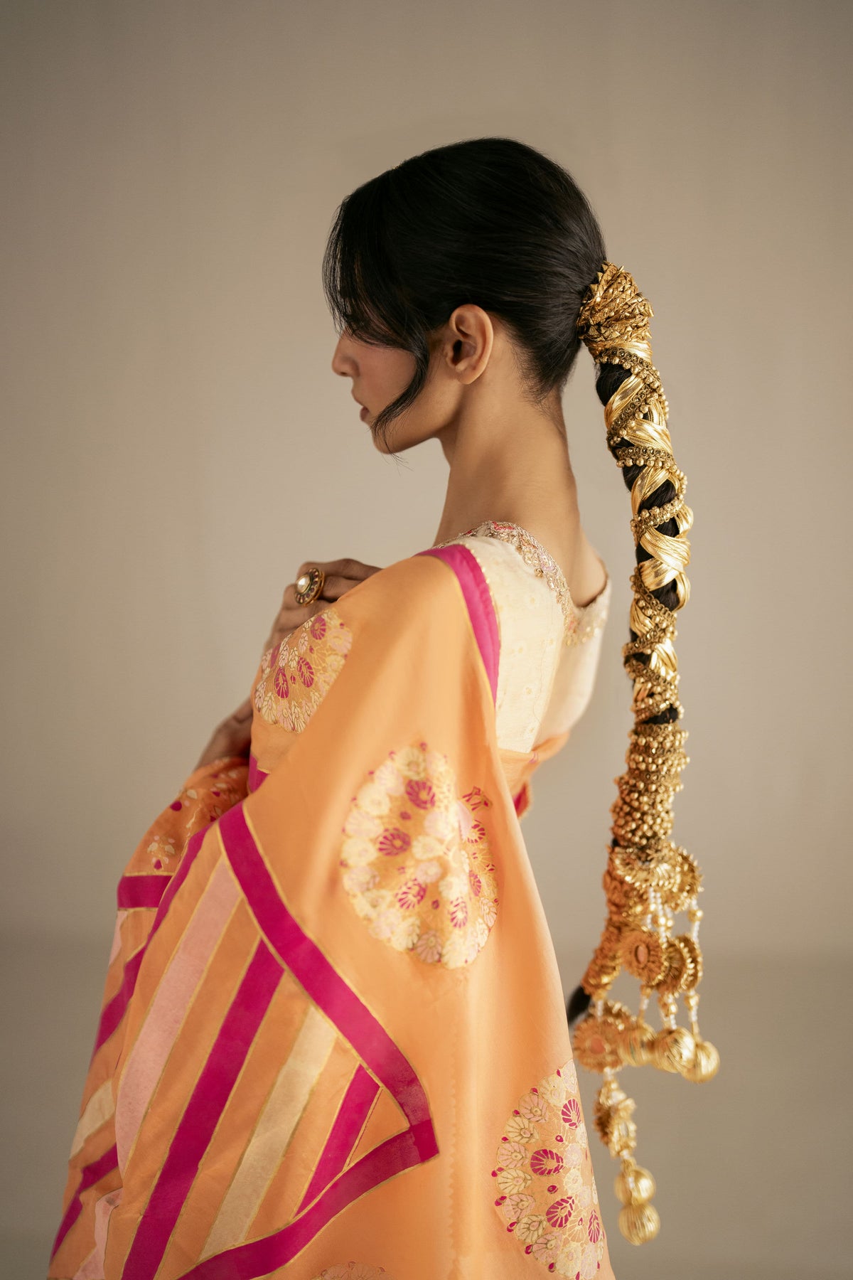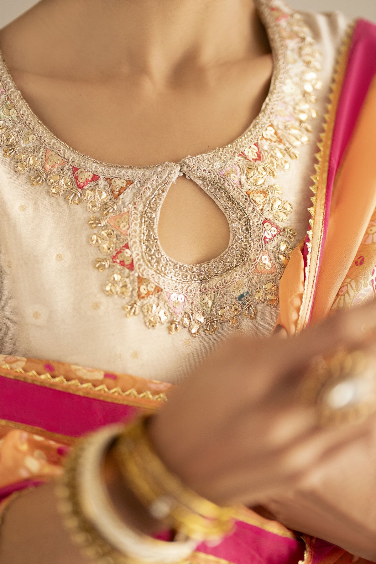 A celebration of traditional craft, this beige cotton net shirt is highlighted with zari and peach-shaded detailing, paired with a striking chatta patti block-print gharara and a flowing matching dupatta.