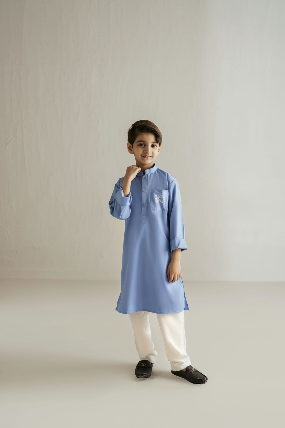 Shehrnaz - Cotton Chambray Elephant Print Kurta Set For Boy - Chambray Blue