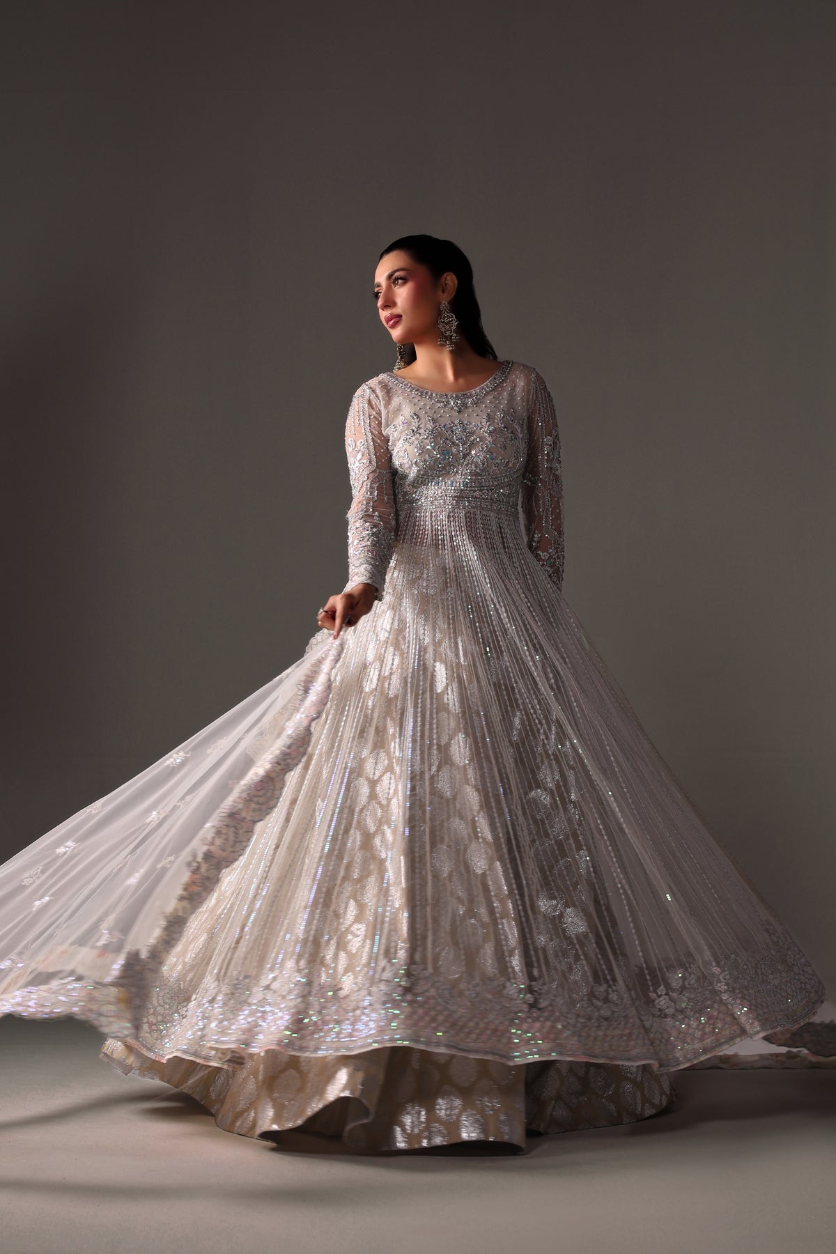 Elane is an exquisite ivory formal pishwas, featuring a meticulously embroidered and embellished bodice and sleeves adorned with sequins, pearls, and crystal detailing. Paired with a beautifully embroidered and embellished net dupatta, an organza zari lehnga, and a raw silk camisole, this masterpiece radiates elegance and sophistication. Ideal for festive occasions and high-end formal events, Elane presents a graceful, luxurious silhouette that commands attention.