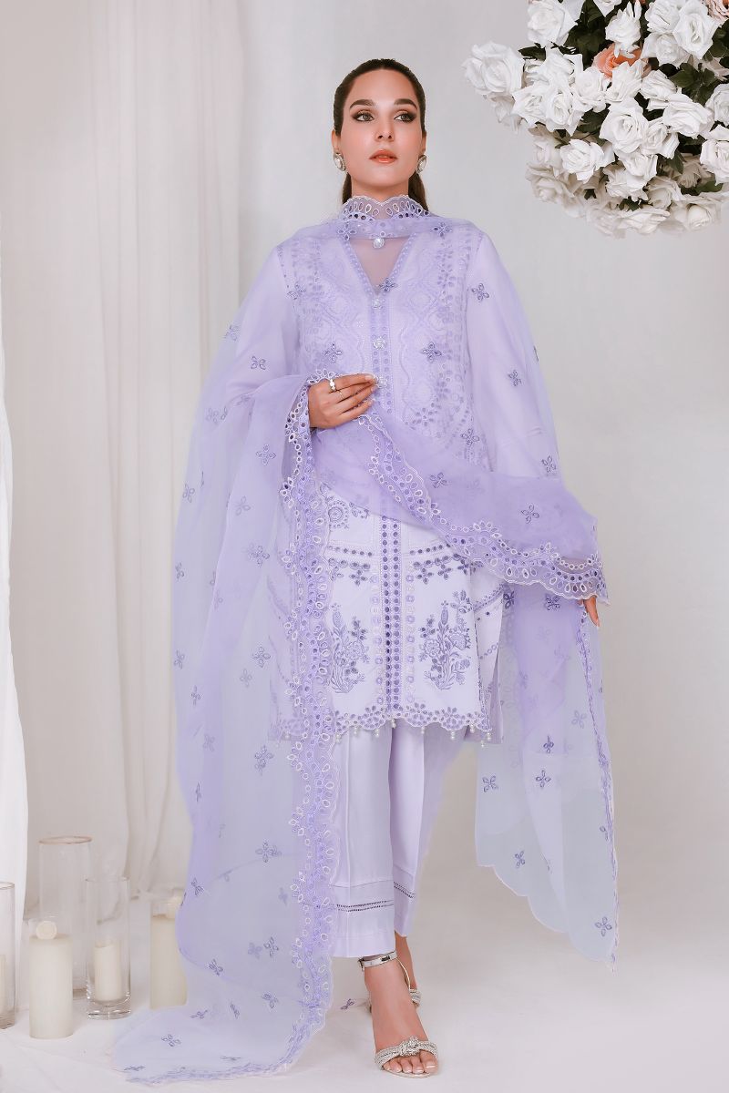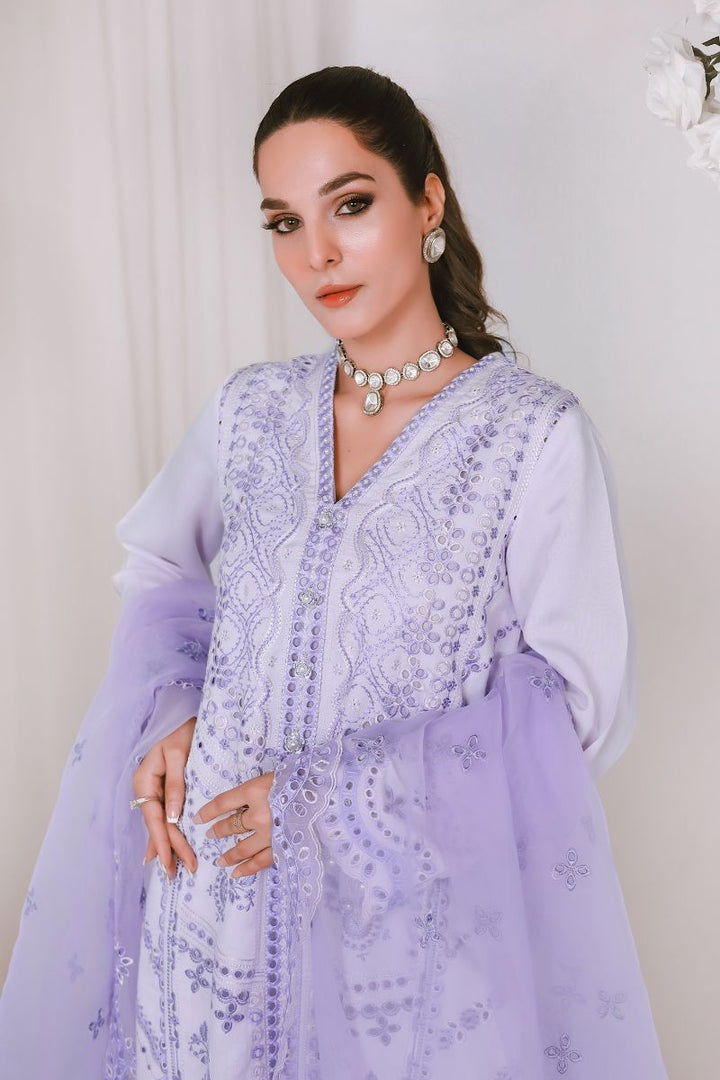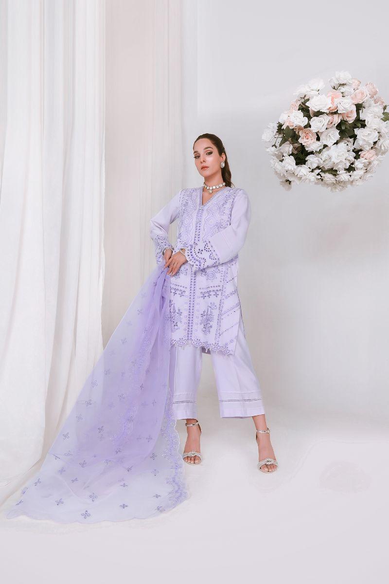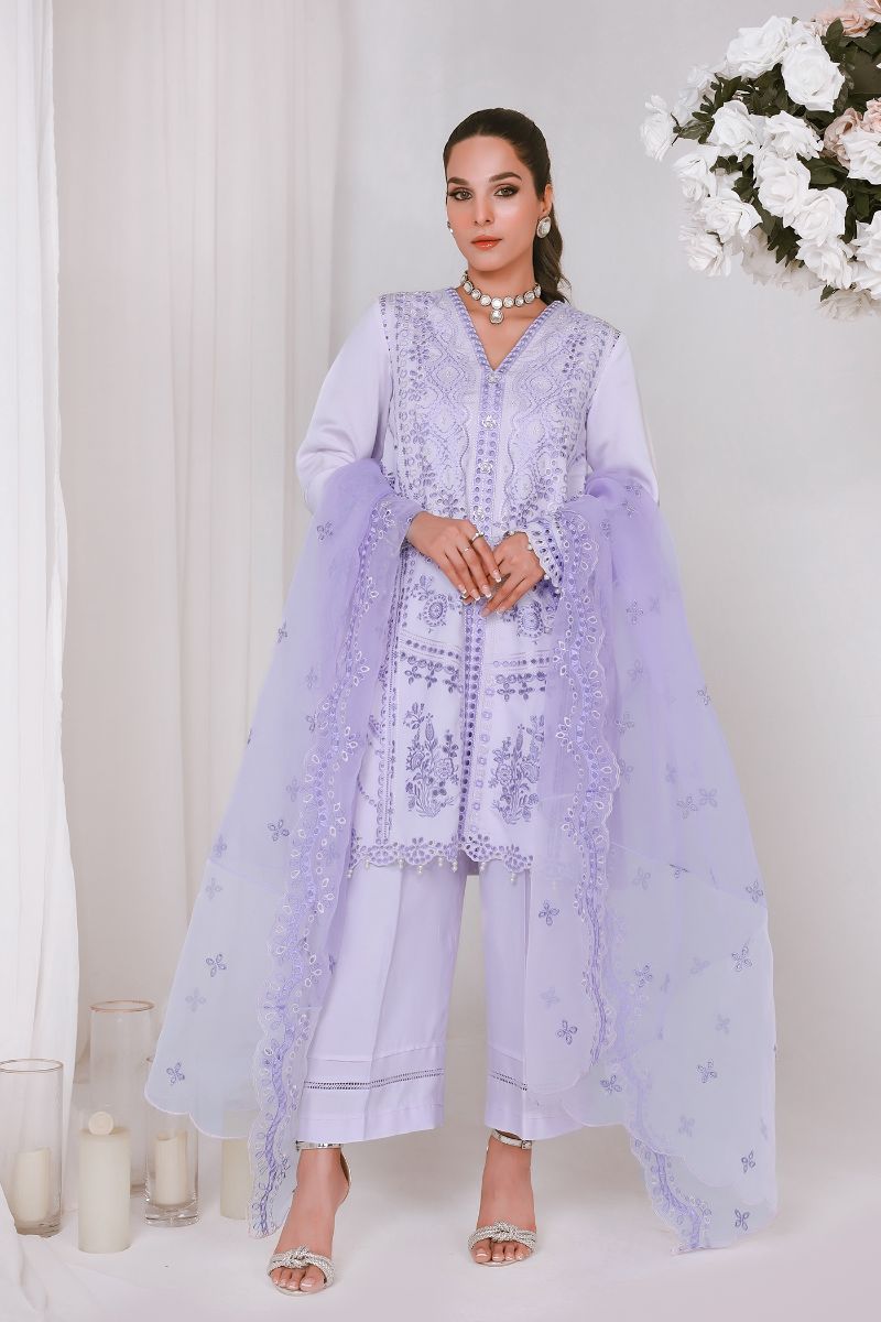The perfect hues of lilac and intricate embroideries make ethercally elegant look for this festive season. This beautiful outfit is paired with organza embroided dupatta and matching culotte.