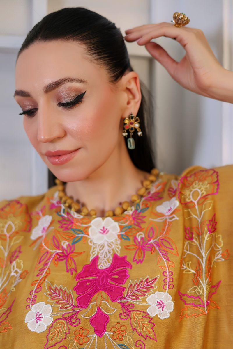 Exuding elegance and showcasing masterful artistry, this outfit embodies the essence of intricate embroidery patterns. With vibrant colors that come to life, it stands as a bold celebration of refined style.