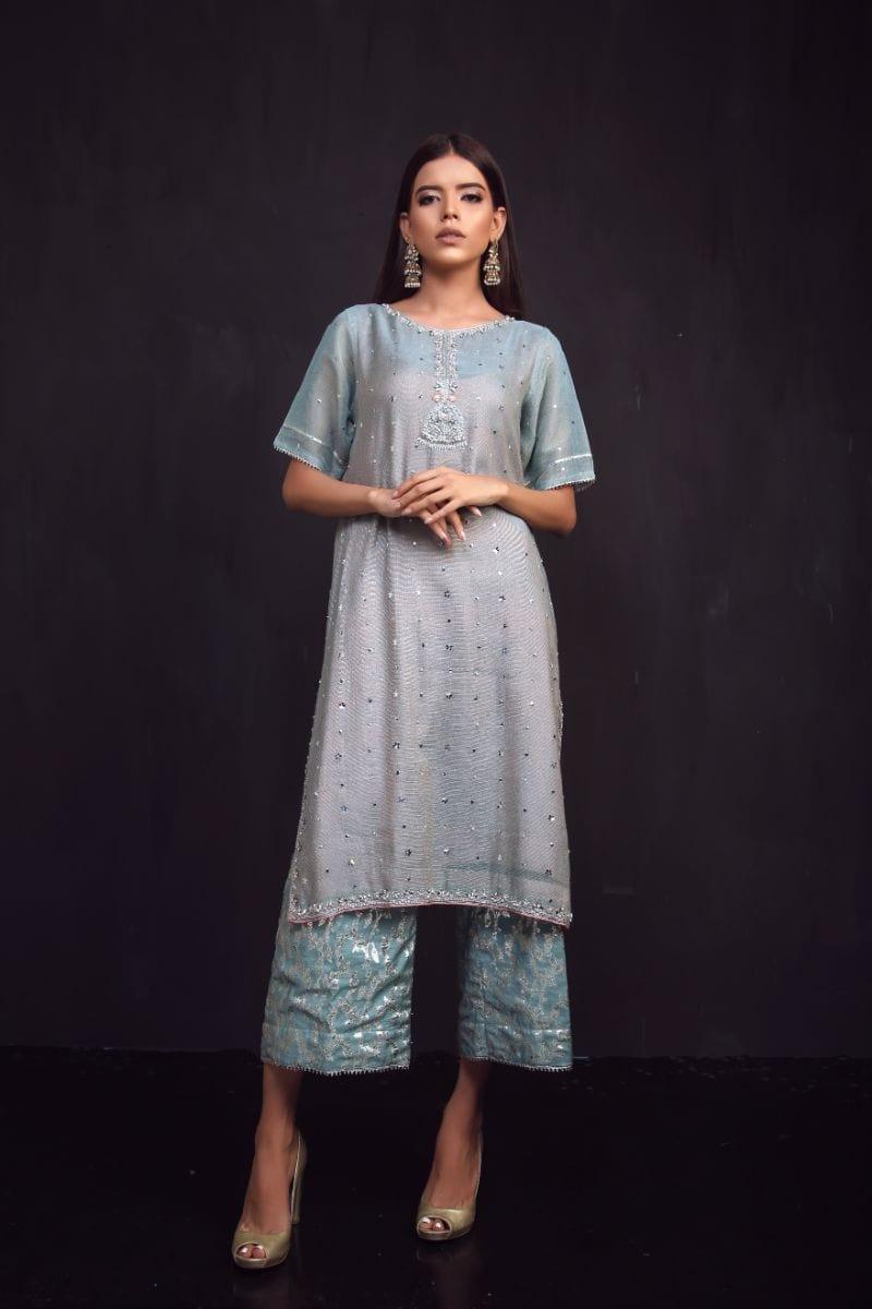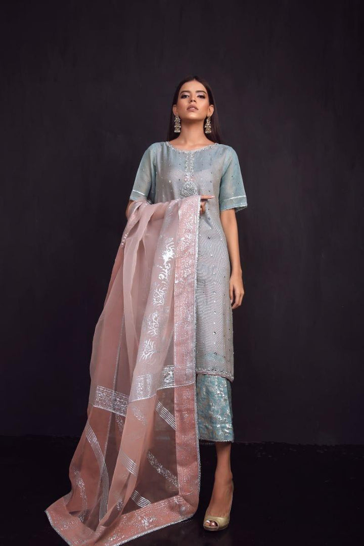 Khaddi cotton shirt with kamdani and diamante embroidery. Organza block print dupatta with silver trim giving an outfit a trendy look. Jamavar culottes