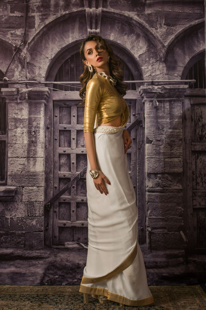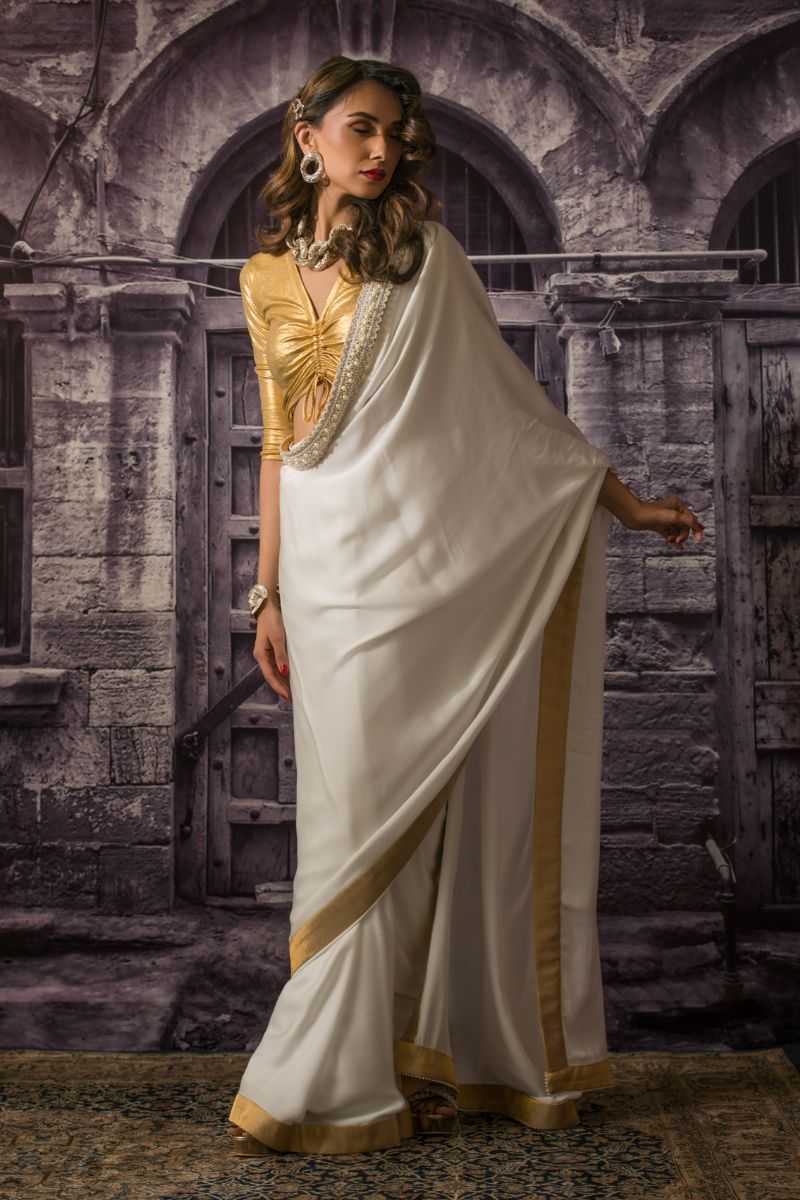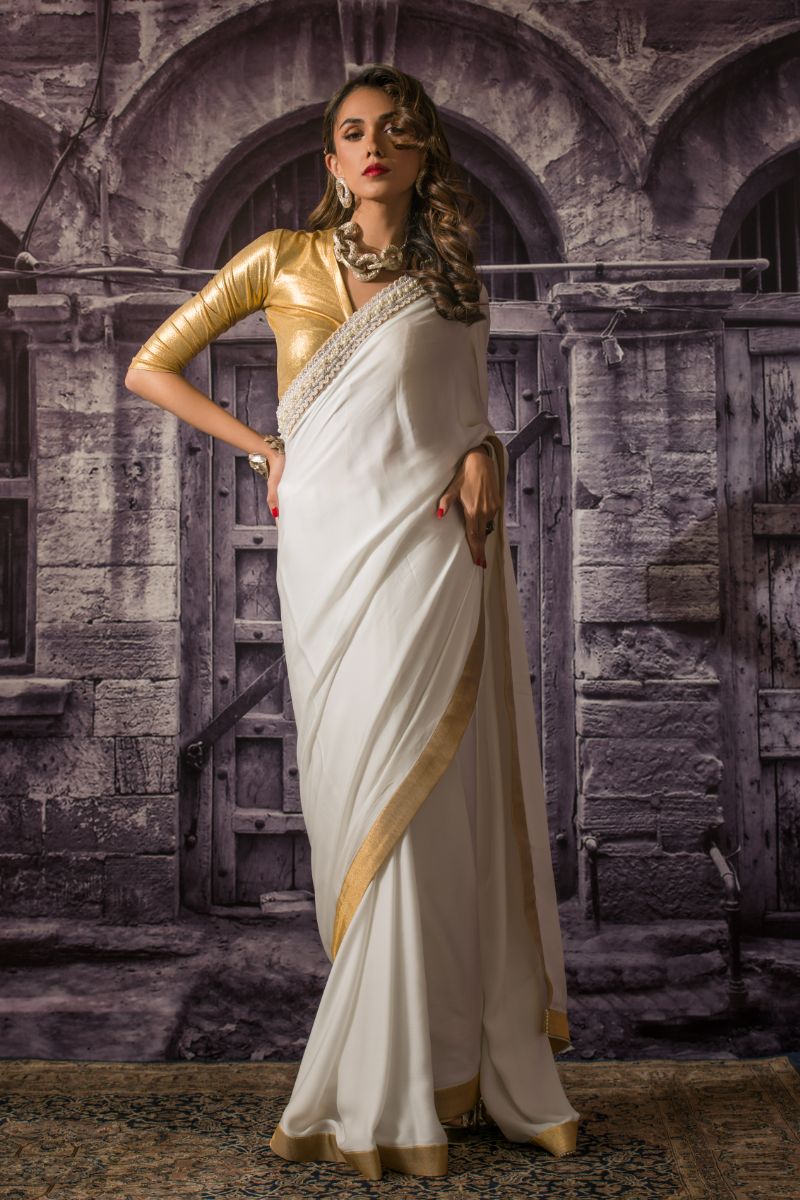A stunning full sari of six yards, trimmed with a pearl encrusted border, finished with luxe gold tissue.