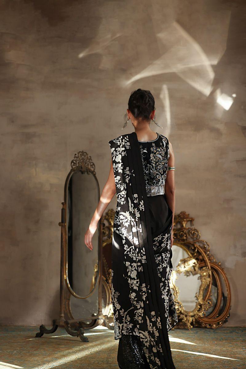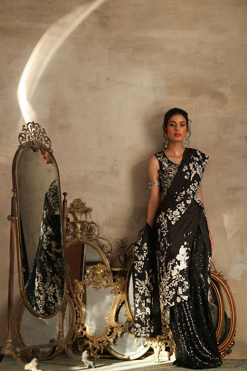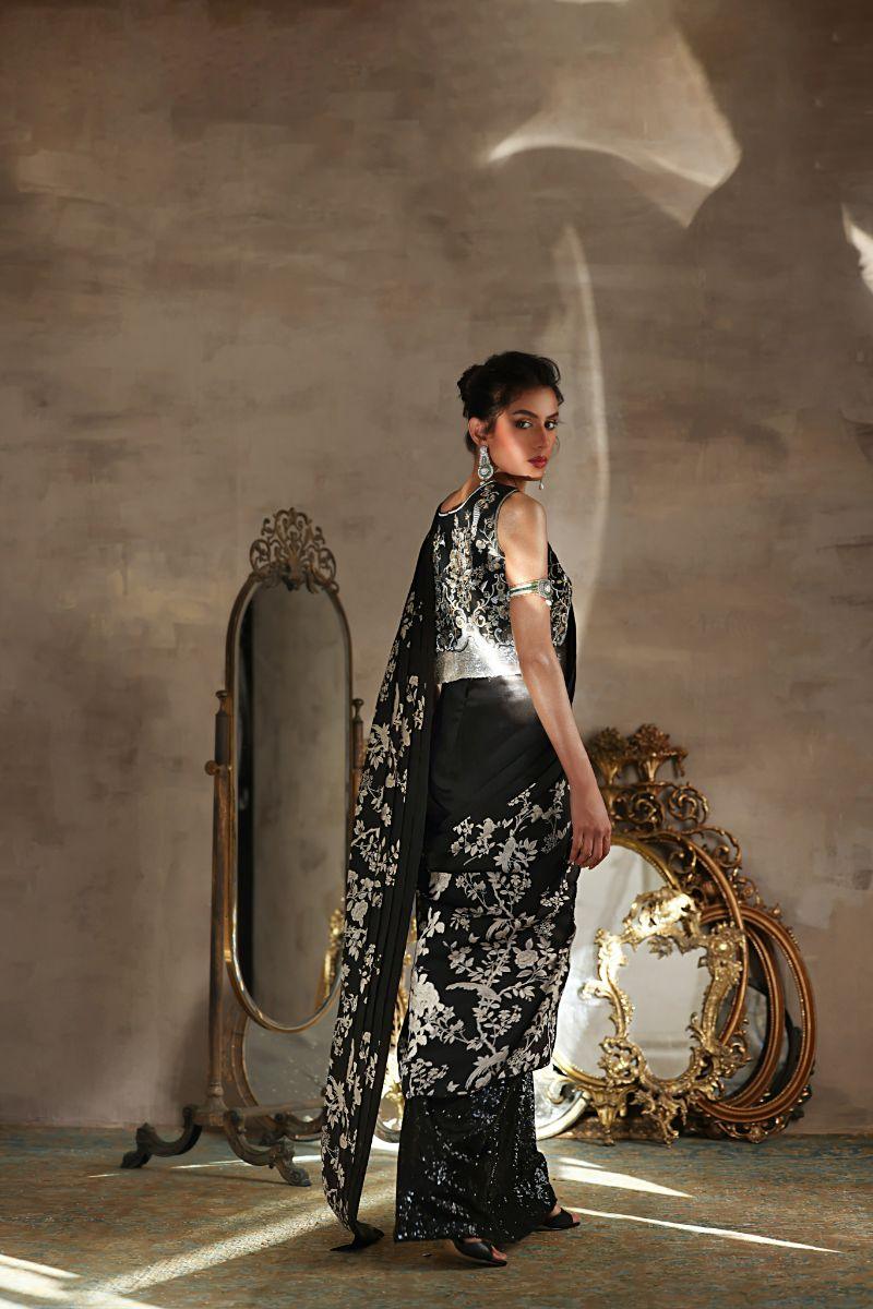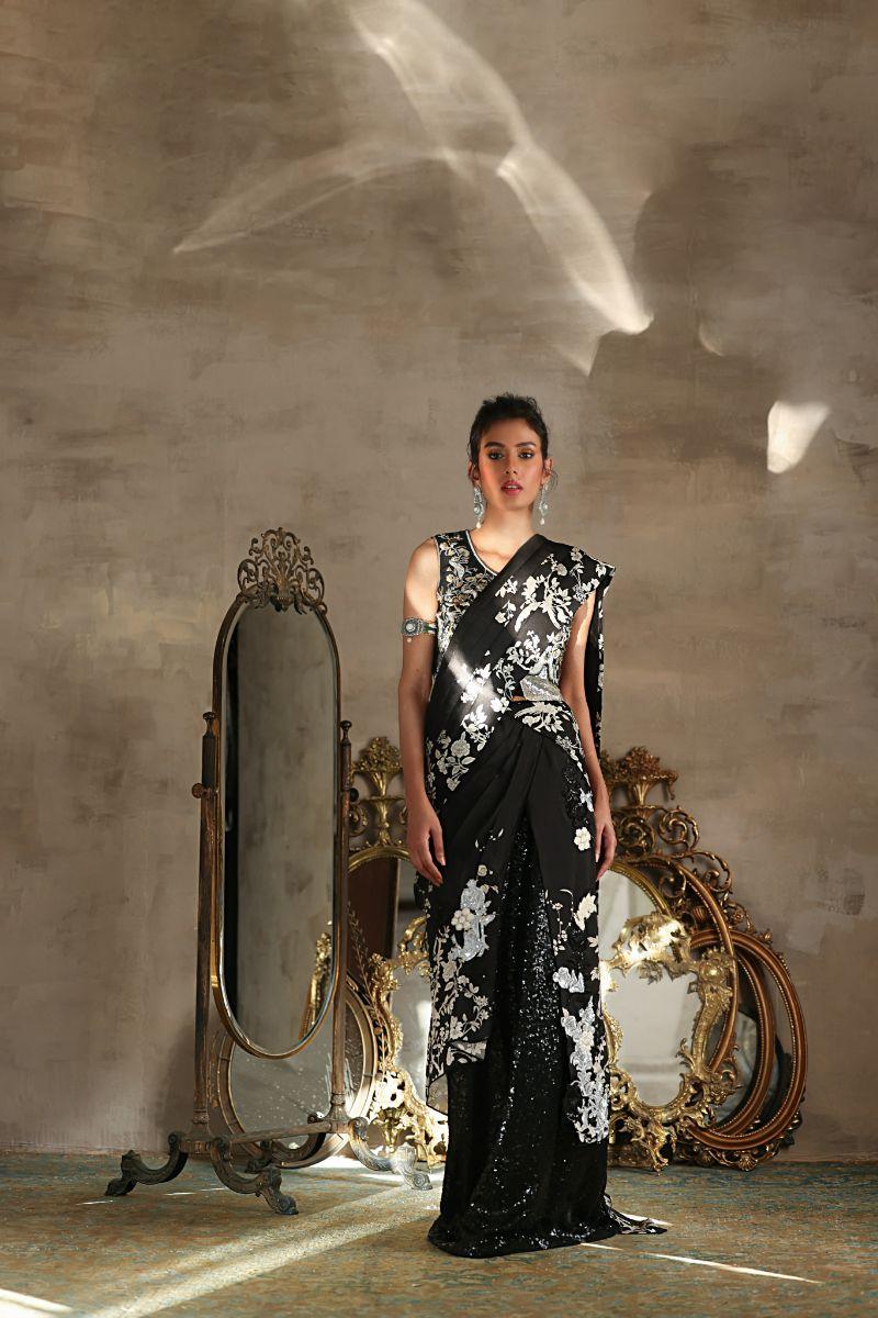 Indulge in the timeless elegance of Sheesha Silk fabric with this exquisite saree, a harmonious blend of modern allure and vintage charm. Crafted to drape gracefully, the saree embodies sophistication and femininity with its flowing texture and luxurious feel. Beautiful machine embroidered silver,black and ivory floral motifs appliqued on the font of the saree. Adorned with delicate vintage floral motifs, each intricately enhanced with meticulous Zardozi work, this saree exudes an aura of regal splendor. The meticulous craftsmanship adds depth and dimension, creating a mesmerizing tapestry of tradition and contemporary finesse. Completing the ensemble is a delicate touch of machine embroidery lace, adding a subtle yet alluring accent to the saree's borders. This fusion of traditional craftsmanship and contemporary design results in a masterpiece that is both timelessly elegant and irresistibly modern.