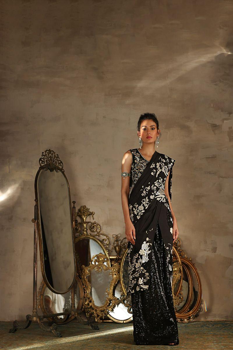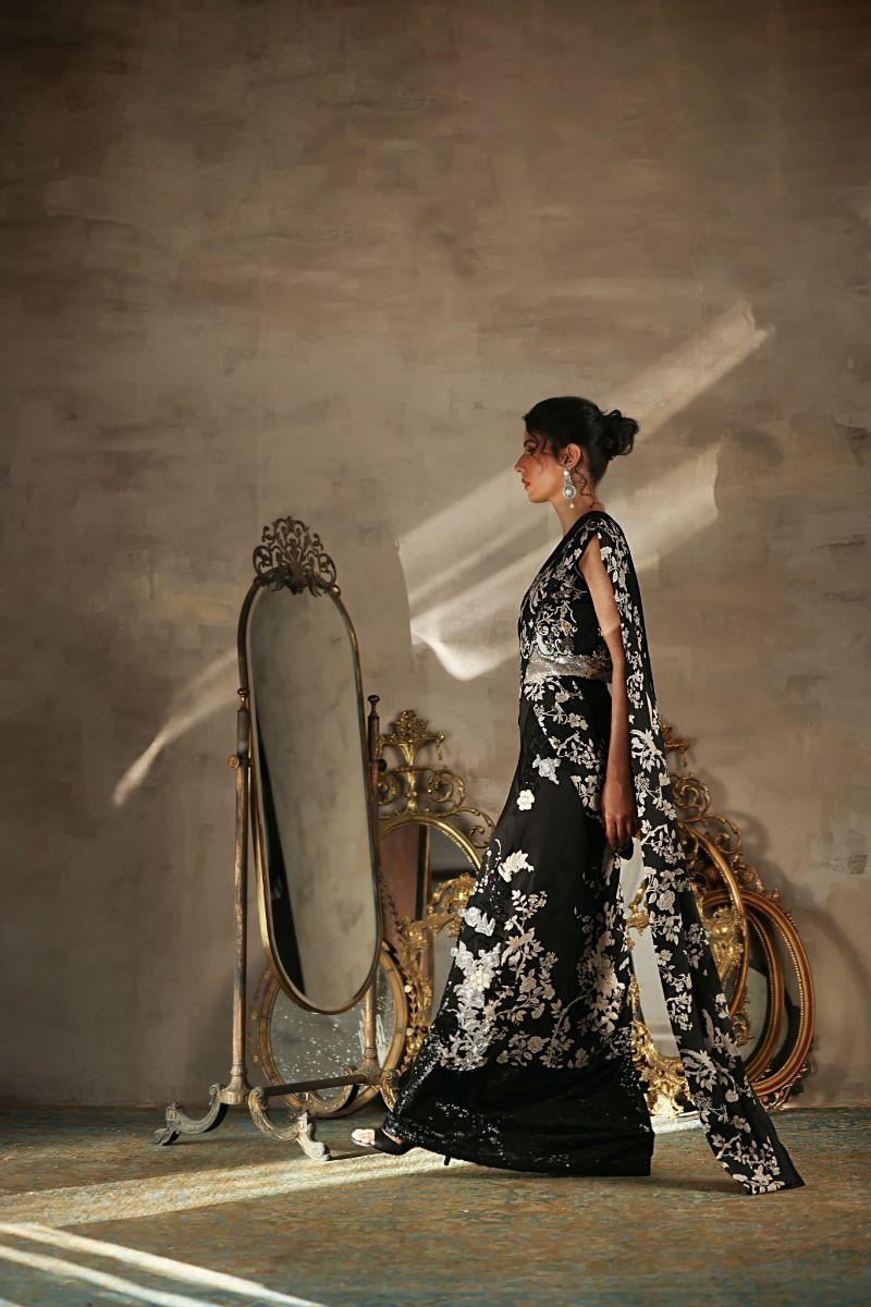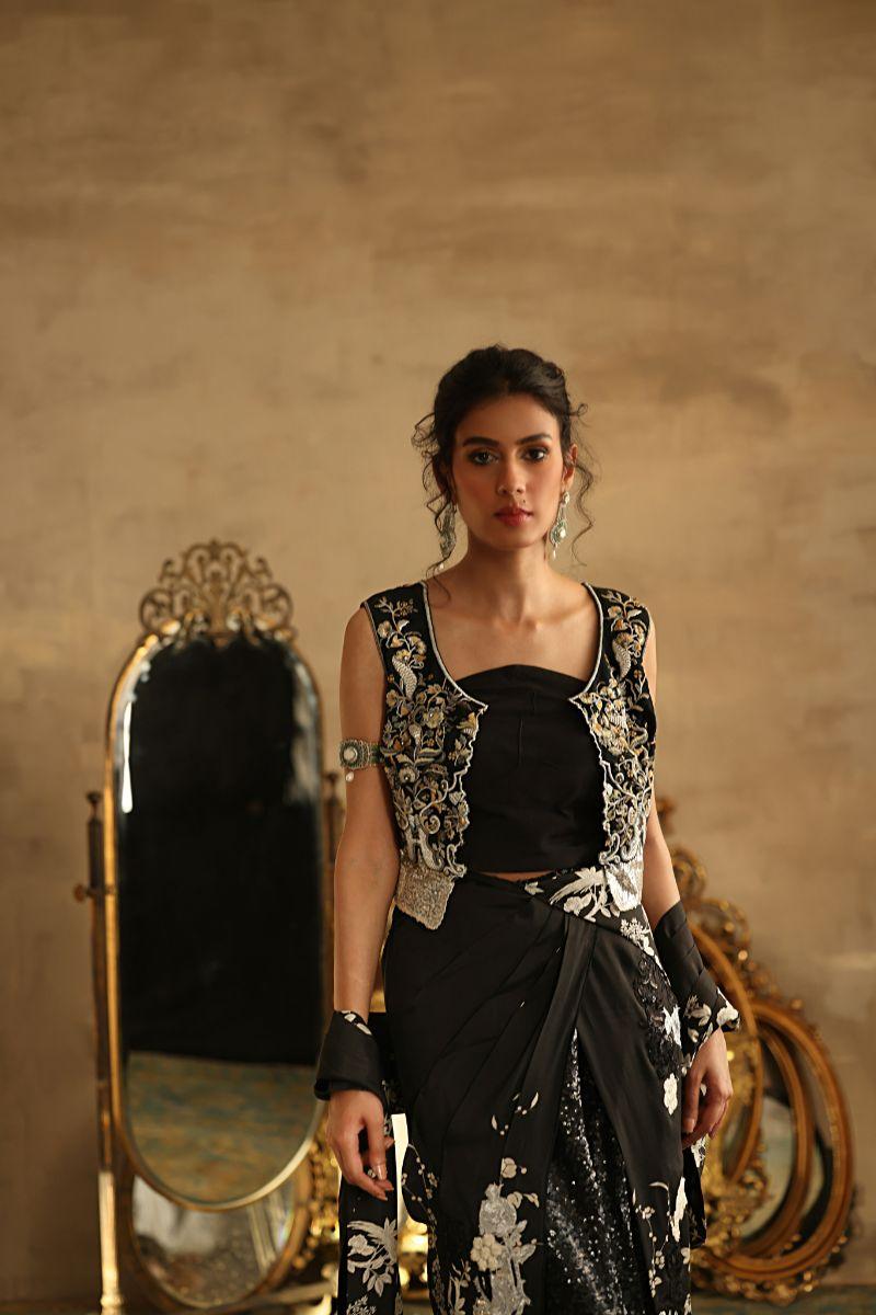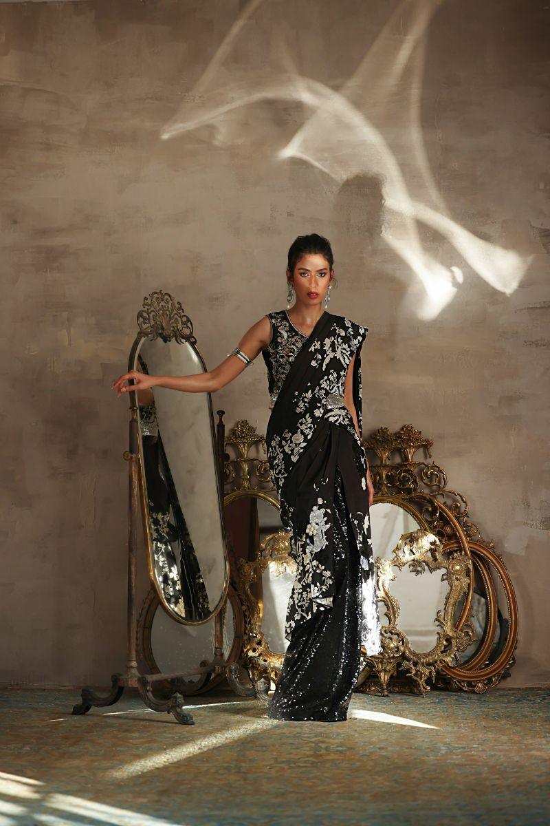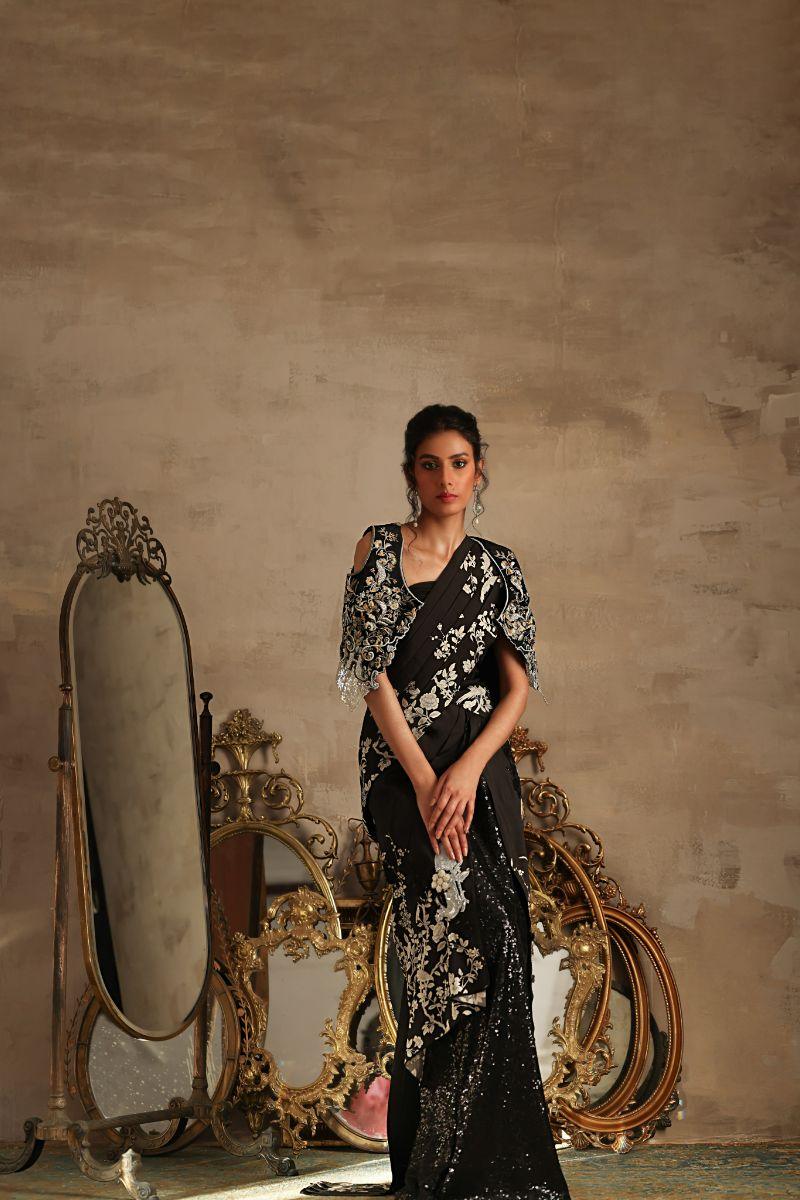 Indulge in the timeless elegance of Sheesha Silk fabric with this exquisite saree, a harmonious blend of modern allure and vintage charm. Crafted to drape gracefully, the saree embodies sophistication and femininity with its flowing texture and luxurious feel. Beautiful machine embroidered silver,black and ivory floral motifs appliqued on the font of the saree. Adorned with delicate vintage floral motifs, each intricately enhanced with meticulous Zardozi work, this saree exudes an aura of regal splendor. The meticulous craftsmanship adds depth and dimension, creating a mesmerizing tapestry of tradition and contemporary finesse. Completing the ensemble is a delicate touch of machine embroidery lace, adding a subtle yet alluring accent to the saree's borders. This fusion of traditional craftsmanship and contemporary design results in a masterpiece that is both timelessly elegant and irresistibly modern.