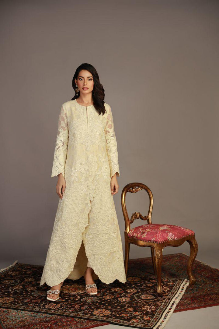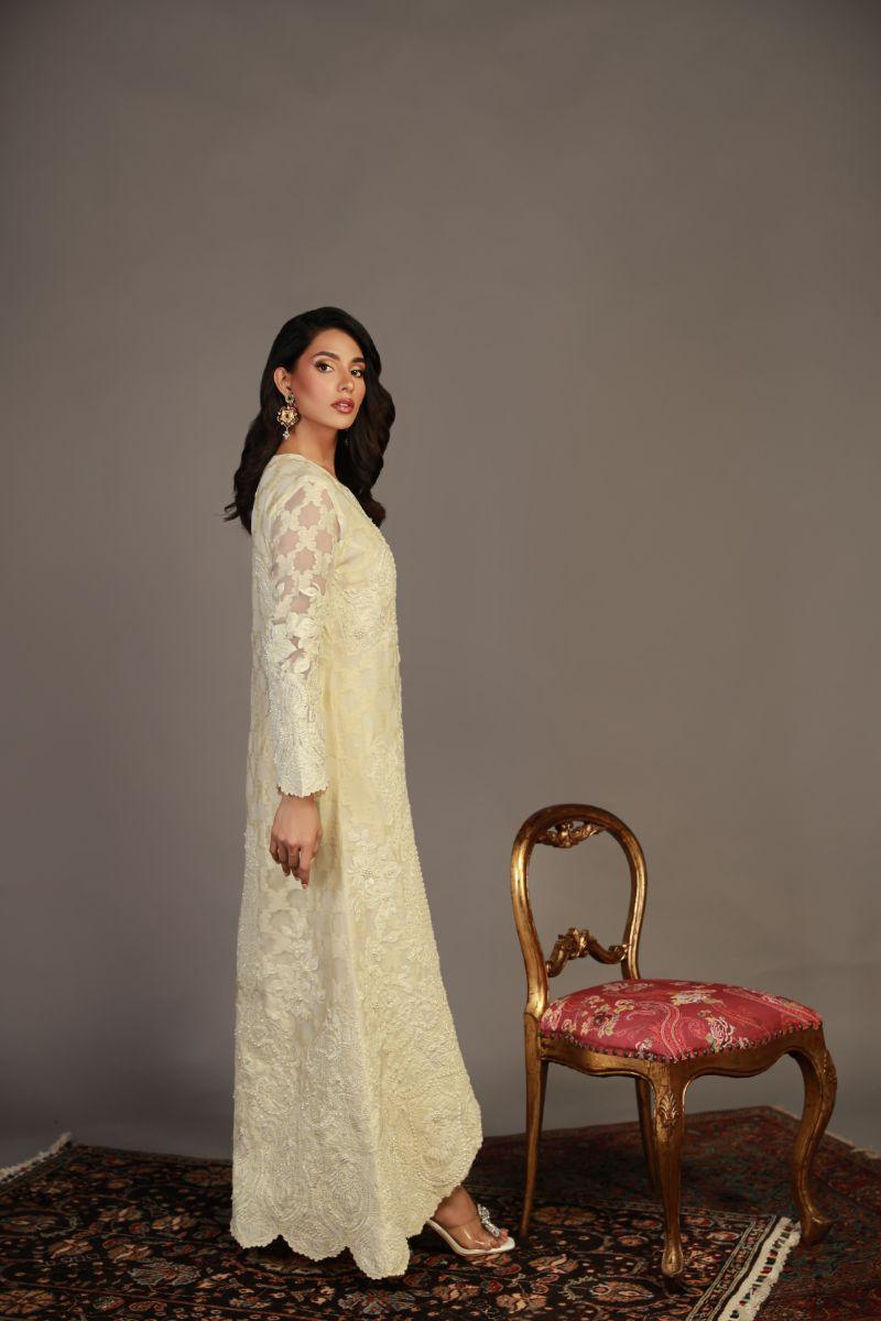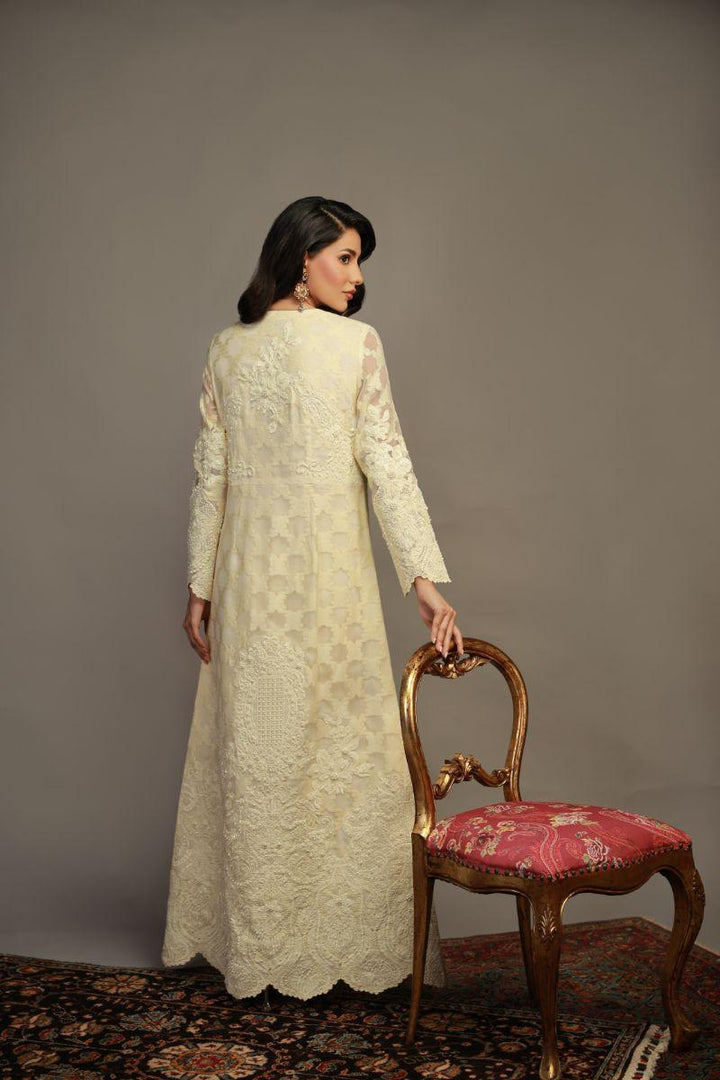 This self-jacquard organza Shirt features intricate ivory embroidery with pearls and a scalloped edge, embodying timeless luxury and grace. It is paired with a straight pant. Fabric Shirt: Self Jacquard Organza Fabric Pant: Khaddi Silk