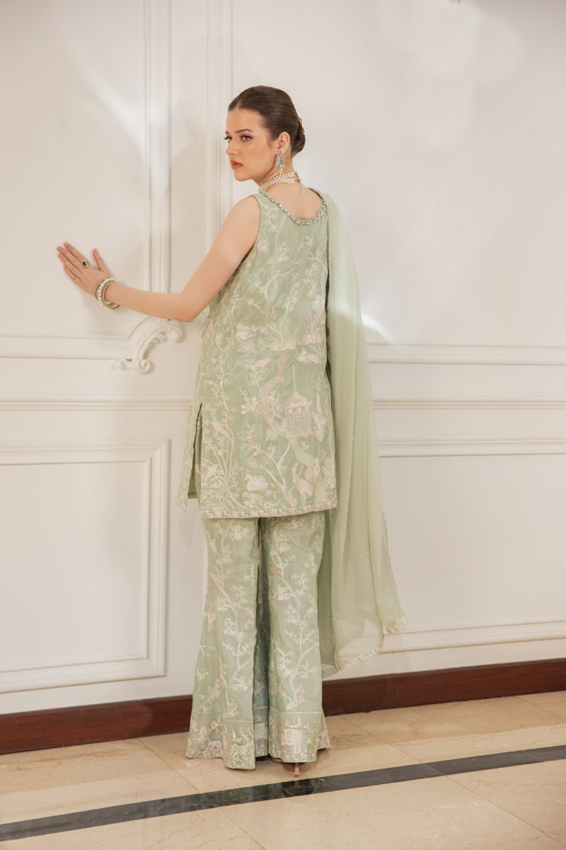 Sea green & beige shirt with pink embroidery paired with matching flare pants & chiffon dupatta with detailing