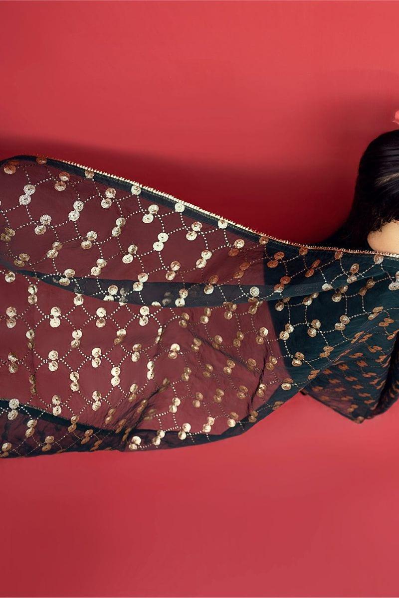 The puff sleeves add a touch of vintage charm and sophistication to the ensemble. Completing the look is a green organza dupatta with heavy sequin embroidery, creating a captivating play of light and texture.