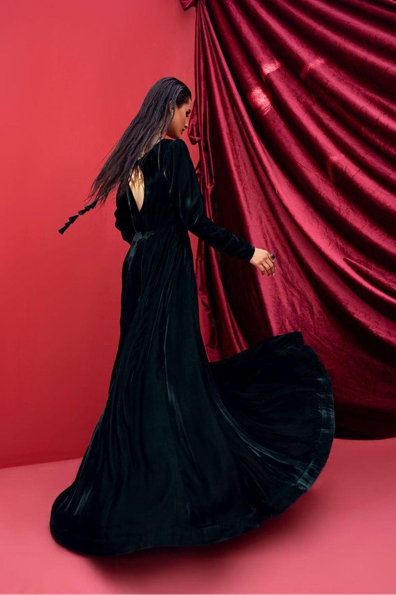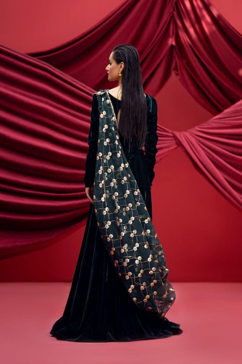 This exquisite green velvet floor-length pishwas features a front boat neck and a striking back open neckline, beautifully finished with tassels for added flair.