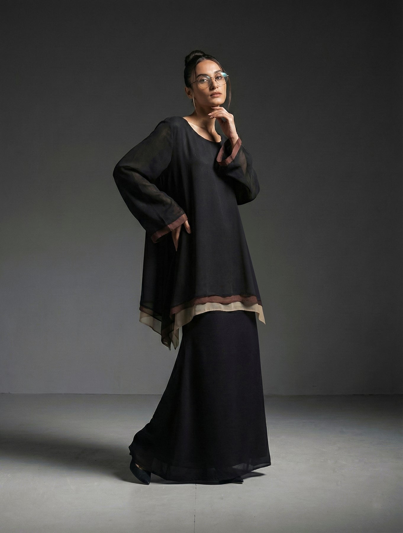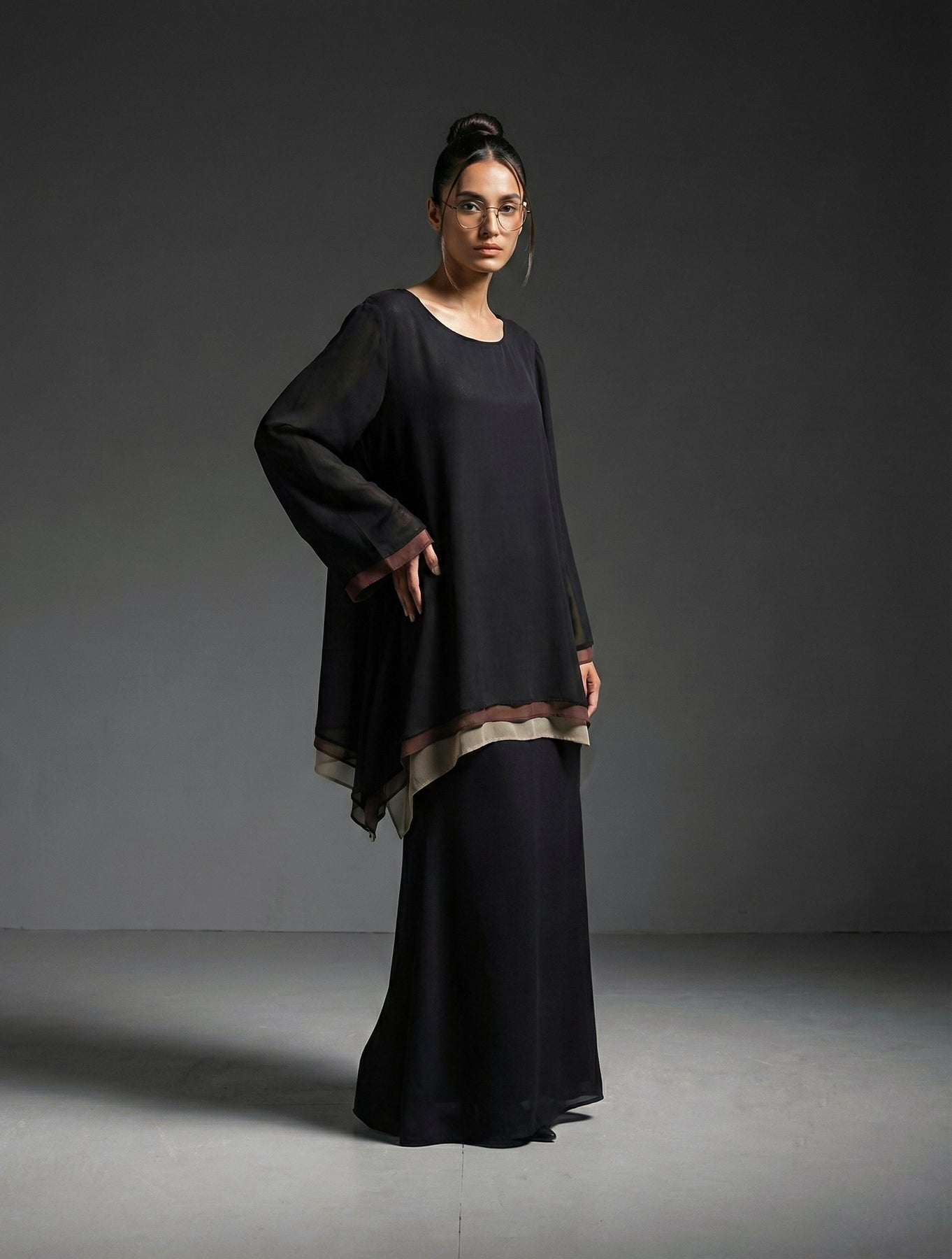 A three-layered chiffon tunic rendered in tonal shades of black, brown, and beige. Designed with a fluid handkerchief hemline for graceful movement, it is paired with flared trousers to create an elongated, elegant silhouette.