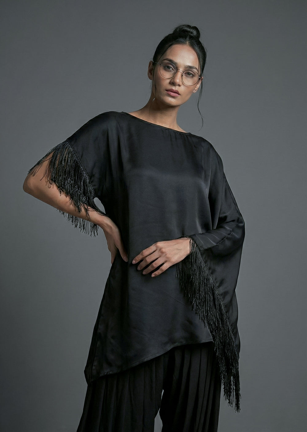 Maheen Khan - Linea Fringe Raw Silk Top For Women - Black - 1 Piece