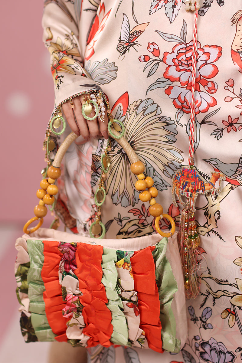 Imperial Blossom crafted from gorgeous printed silk, Musferah Saad’s personal research into heritage Chinoiserie led to the creation of this all-over print featuring oversized lotuses, peonies, and sprawling vines, designed to elongate the figure with a statuesque grace. Signature Highlights: The Botanical Canvas: A lush, all-over print on printed silk featuring oversized lotuses and peonies that turn the garment into a 360-degree work of art. Chinese Angrakha Silhoutee: A unique, wrap-style neckline that provides a sharp, modern presence while nodding to architectural heritage. Artisanal Cuffs: The sleeves are finished with a delicate beaded and coin-like fringe, adding a touch of melodic movement and high-end detail. Handmade Heritage Tassel: The front is detailed with a signature resham tassel featuring traditional camel and bird motifs, accented with crystal hangings for an extra flair to make heads truly turn. "With this creamy white ensemble, Imperial Blossom, I wanted the oversized florals to represent a gorgeous, chic presence, while the Chinese angrakha cut reveals a sharp, modern edge. The handmade tassels and coin-fringe cuffs are my way of adding a touch of whimsical luxury to a powerful, scenic narrative." — Musferah Saad Color: Cream Flora Includes: Kaaftan Add on: Signature Pouch Matching Bandana Fabric Details: Kaftan: Premium Printed Silk Size Customize: Yes Color Customization: yes Delivery time: 2-3 WEEKS Note: We have made every possible effort to display the colors of the products accurately. However, the possibility of difference between the actual color and the display color might exist because of various types of screens & displays.