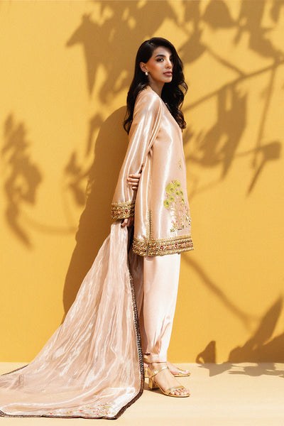 This look brings a soft, luminous take to festive elegance in a rose quartz hue. Intricate zardoze embroidery, inspired by Mughal warriors, tells a story along the front of the tissue shirt, while contrasting embellished velvet borders highlight the neckline, sleeves, and hemline, adding richness to the piece. The soft charmeuse shalwar reflects the same gentle tone, keeping the silhouette refined and cohesive. A fluid, diaphanous tissue dupatta drapes dramatically, finished with zardoze embroidery on velvet edging for a quietly luxurious touch.Design may vary slightly from the display images.A variation in size of +/- 2 inches is considered within an acceptable tolerance.