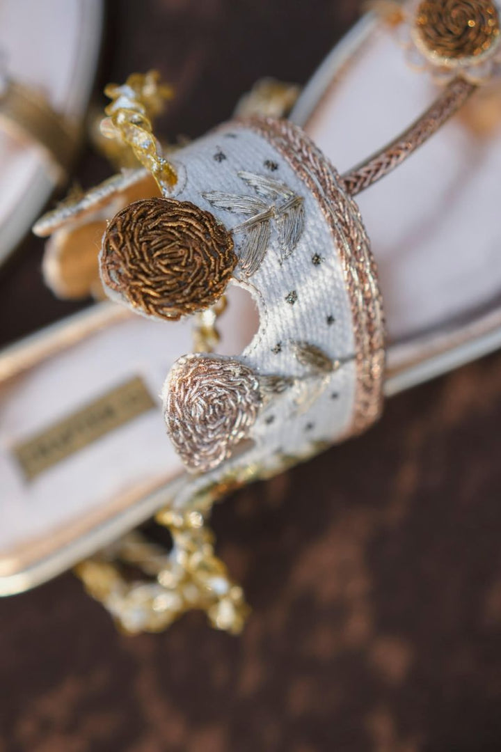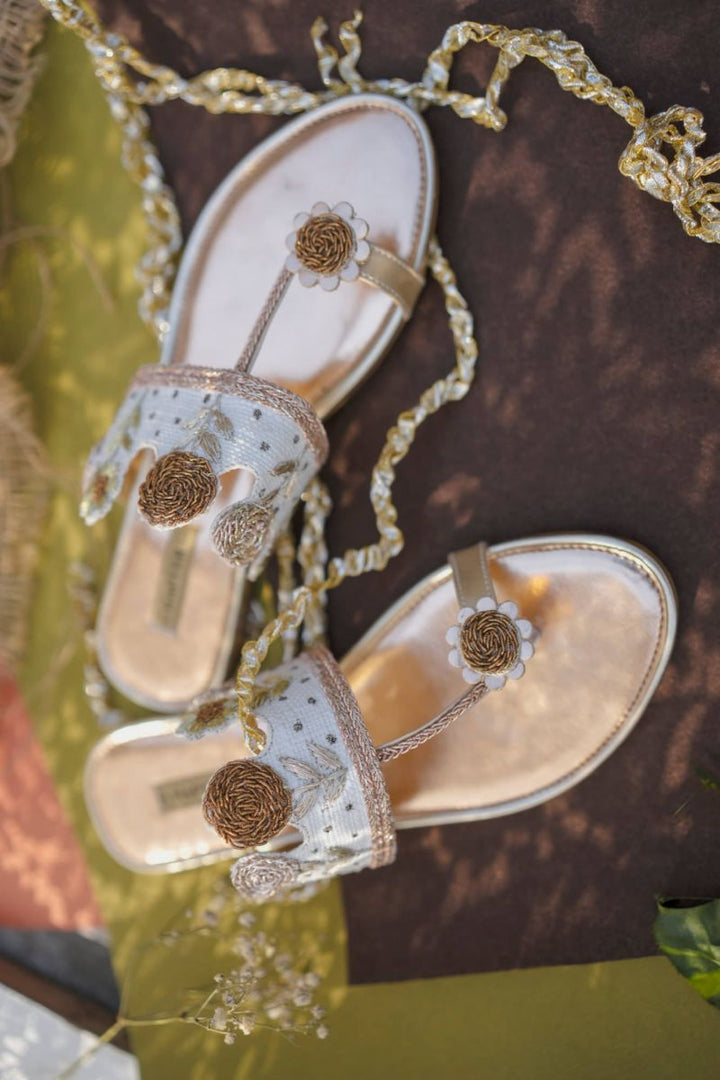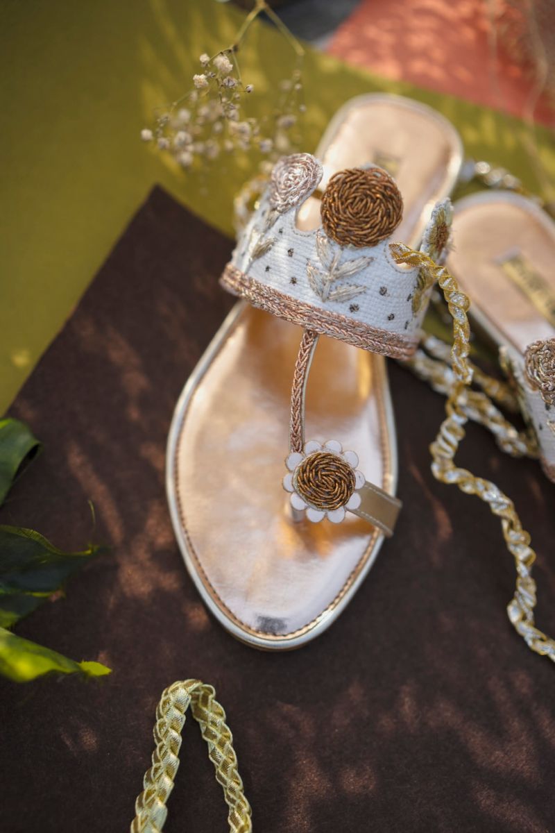 Step into a world of gold with Kohlapuri | Nooreh. This playful pair features three shades of shimmering bronze, white gold and rose gold on white jute fabric. Hand embroidered flowers in dabqa and tilla material, and rose gold dabqa braid. With a bronze dabka flower set on a rexene cut out for the thumb and a rose gold insole, every step is gold.
