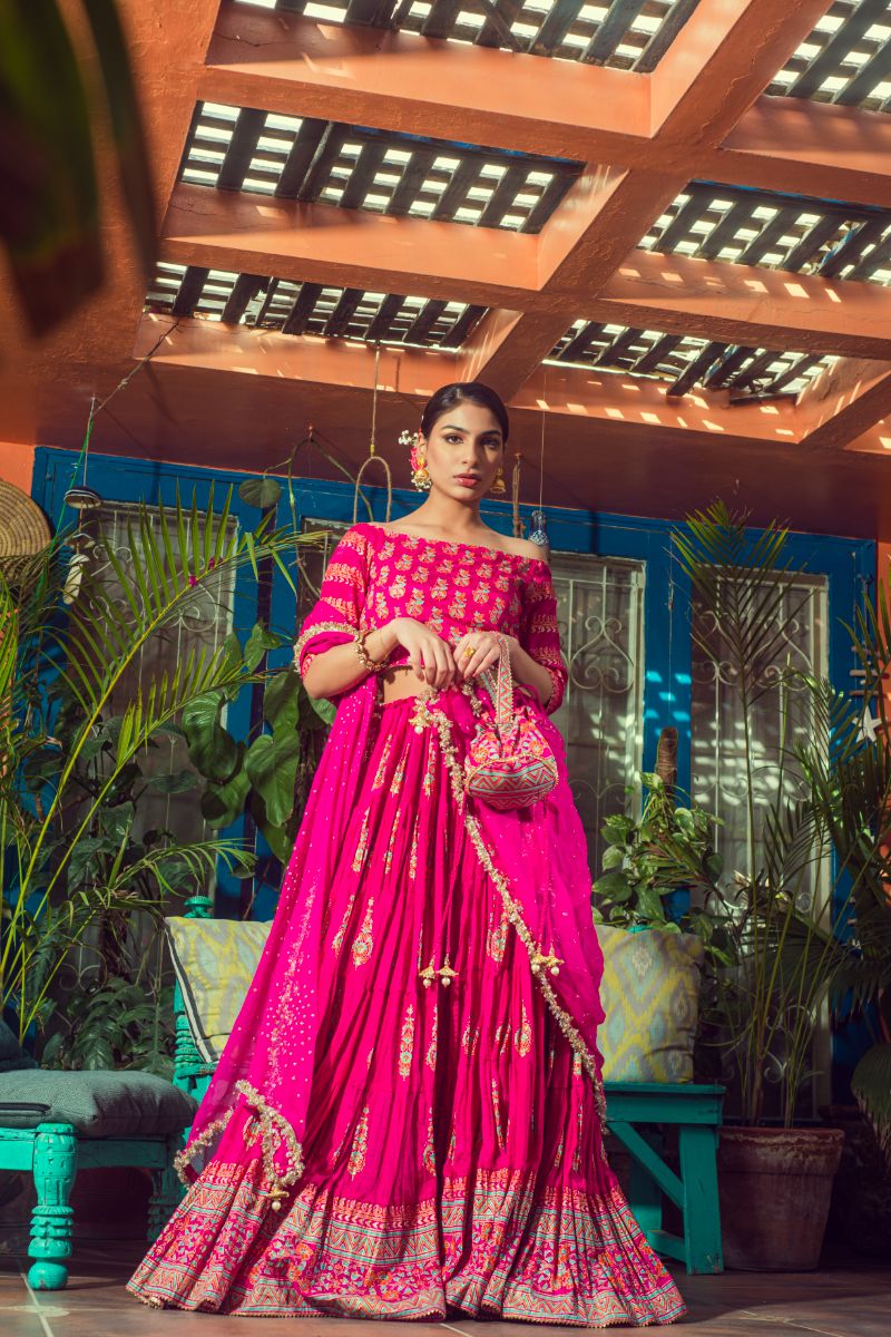 Hot pink Lehnga blouse This theme is a beautiful blend of heritage and contemporary elegance, celebrating the rich art of hand block printingusing age-old techniques. The focus is on bold colors, intricate patterns, and cultural depth, making it perfect for a Mehndi or pre-wedding event where vibrancy and tradition take center stage. Multi layered Lehnga with a flair off 20 yards approximately. Model is wearing off shoulder blouse but regular sleeves can be added on request. Dupatta has star burst sprinkle and finished with gota edging. Model is wearing 15inches length blouse and 42 inches Lehnga. Fabric is Pakistani silk and net dupatta. Matching groom’s outfit can be ordered.