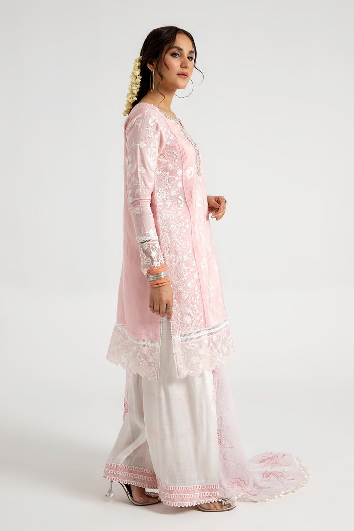 Pink shirt with white embroidered jaal on the front pannel and framed embroidery on the side panels, with the borders ,laces and pleated details.