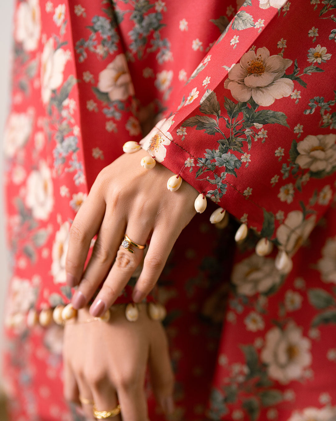 Make a statement with our kameez and flare pant set, featuring a vibrant red print adorned with beige floral motifs.
