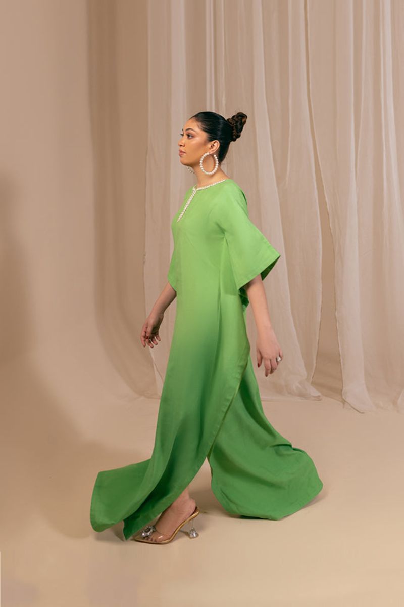 This white and brown ombre kaftan strikes the perfect balance between simplicity and detail. The softly shaded tones blend seamlessly, while the embroidered neckline, accented with delicate sequins, adds a hint of sparkle. Designed for a light and graceful drape, this kaftan offers an effortless feel, combining comfort with a touch of elegance..