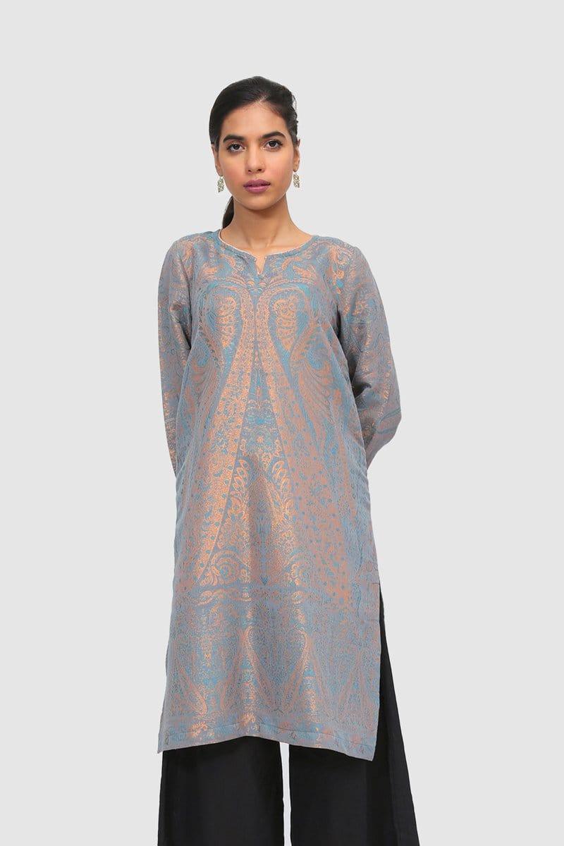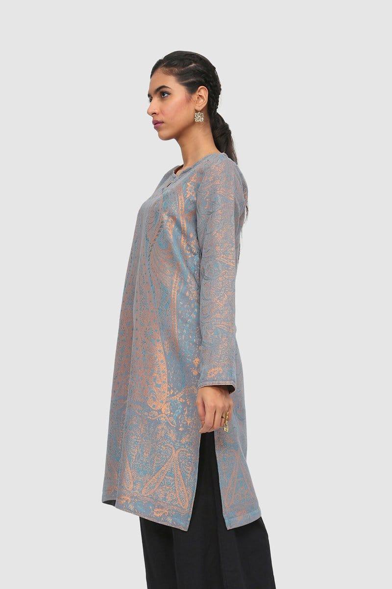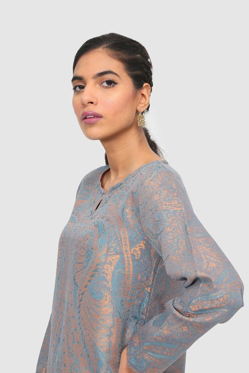 Metallic, Kashmiri paisley jacquard A-line shirt with V-neck.