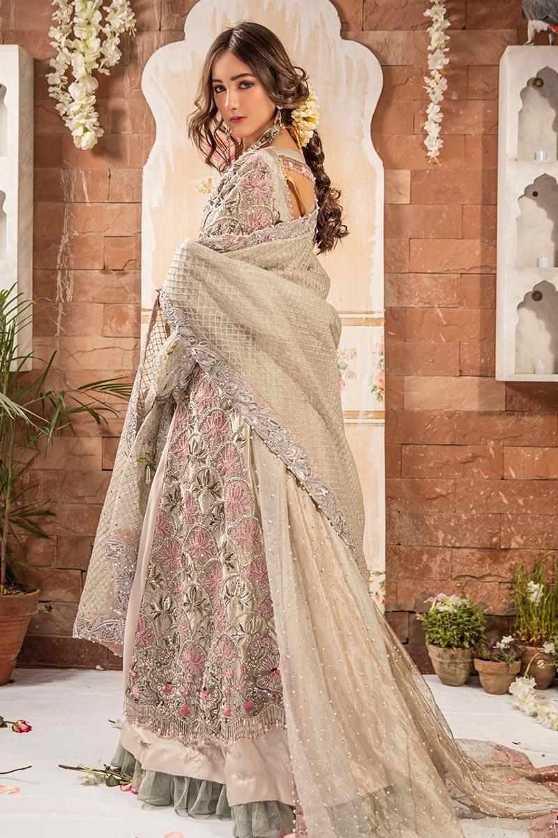 Pure shimmer organza gown with fully embellished front with adda work. Work of thread and tilla with sequins. Back is made of silver zari net in trail with full spray of pearl and Swarovski. Finishing’s with cut dana and beads hangings. Raw silk lehnga with digitally printed flowers spray and pearl hangings with them. Dupatta in embroidered organza, front side border with adda work, other three sides with lace. (3 PC stitched)