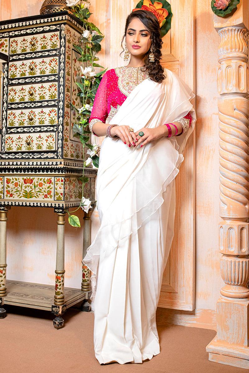 Shocking pink organza blouse with white embroidery n tilla embellished neckline. Full sequins spray on front and back of blouse. White silk sarri with white organza frill.