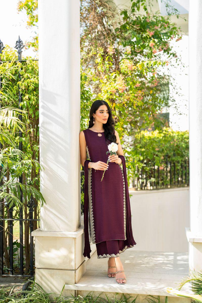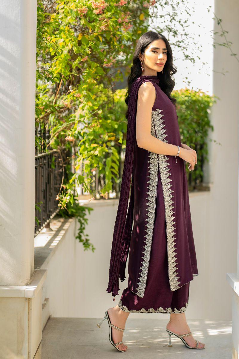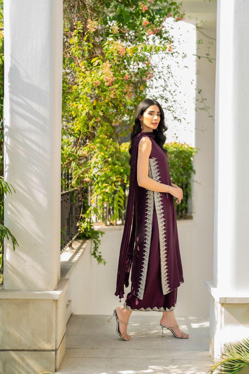 Composition Tunic: Raw Silk Pants: Raw Silk Dupatta : Crushed Silk Dry Clean Only deep plum hand- embellished with crystal work along sides (three piece set) Striking crystal embellishment stretches across the side lapels in a glistening paisley pattern against a deep plum. Paired against a wide leg trouser detailed with hand-work and a crushed silk dupatta. Perfectly suited to the season's events, it is the go-to piece for any occasion.