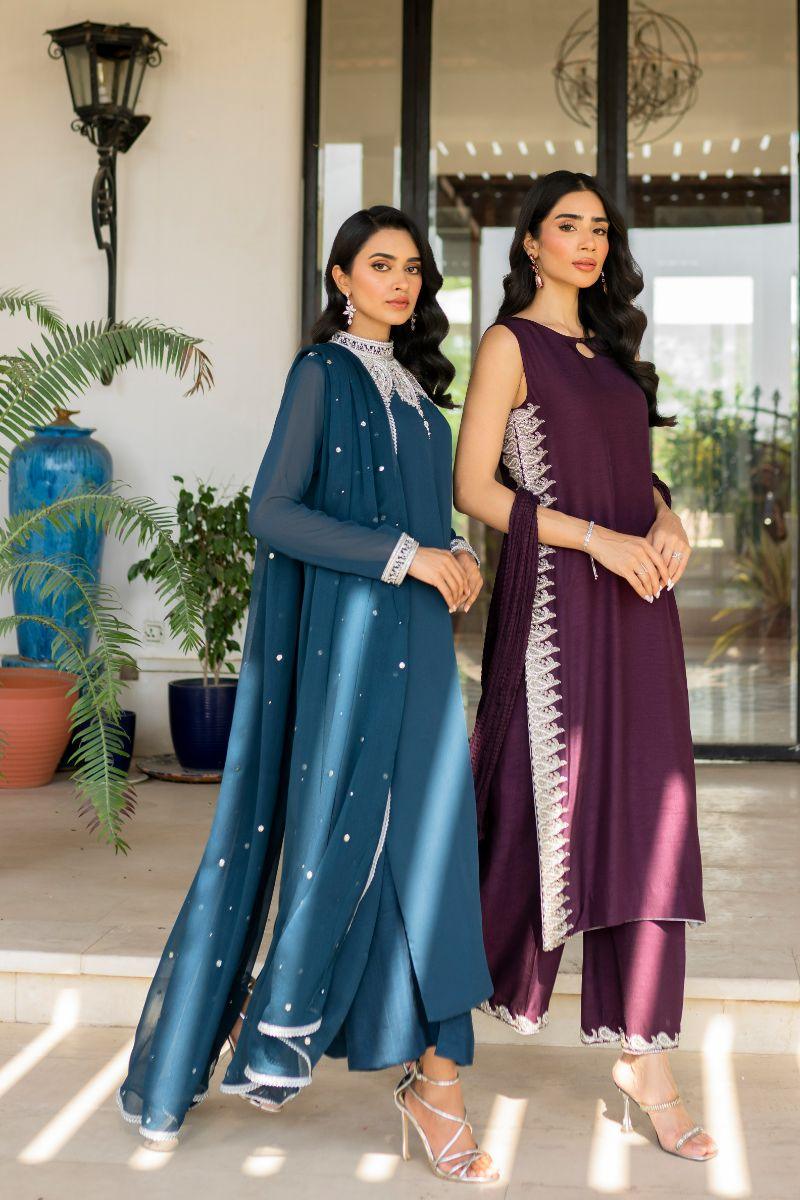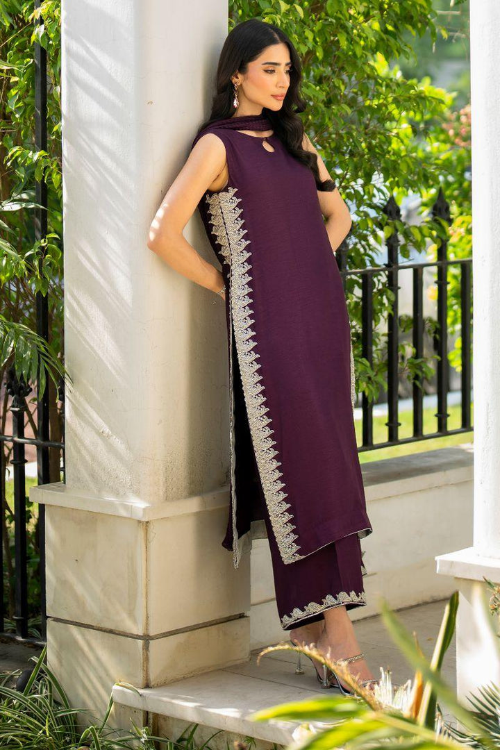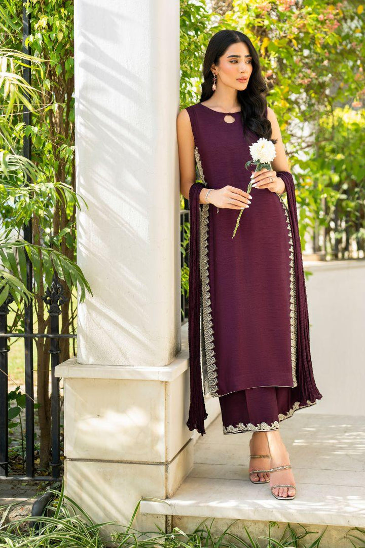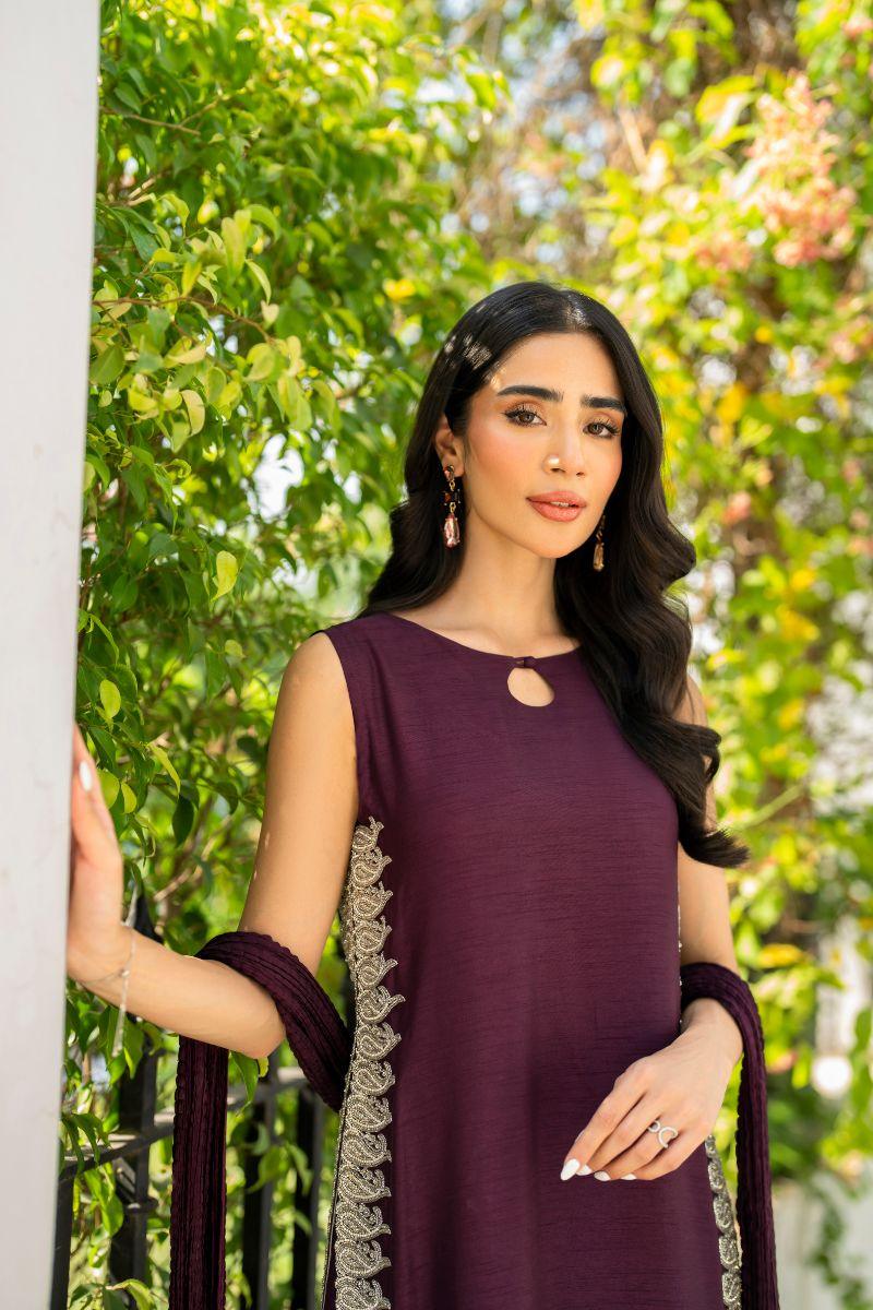 Composition Tunic: Raw Silk Pants: Raw Silk Dupatta : Crushed Silk Dry Clean Only deep plum hand- embellished with crystal work along sides (three piece set) Striking crystal embellishment stretches across the side lapels in a glistening paisley pattern against a deep plum. Paired against a wide leg trouser detailed with hand-work and a crushed silk dupatta. Perfectly suited to the season's events, it is the go-to piece for any occasion.
