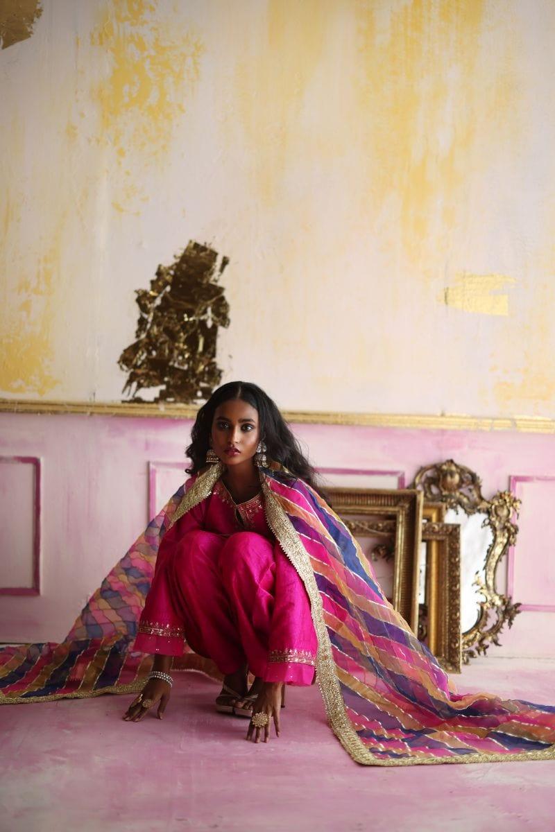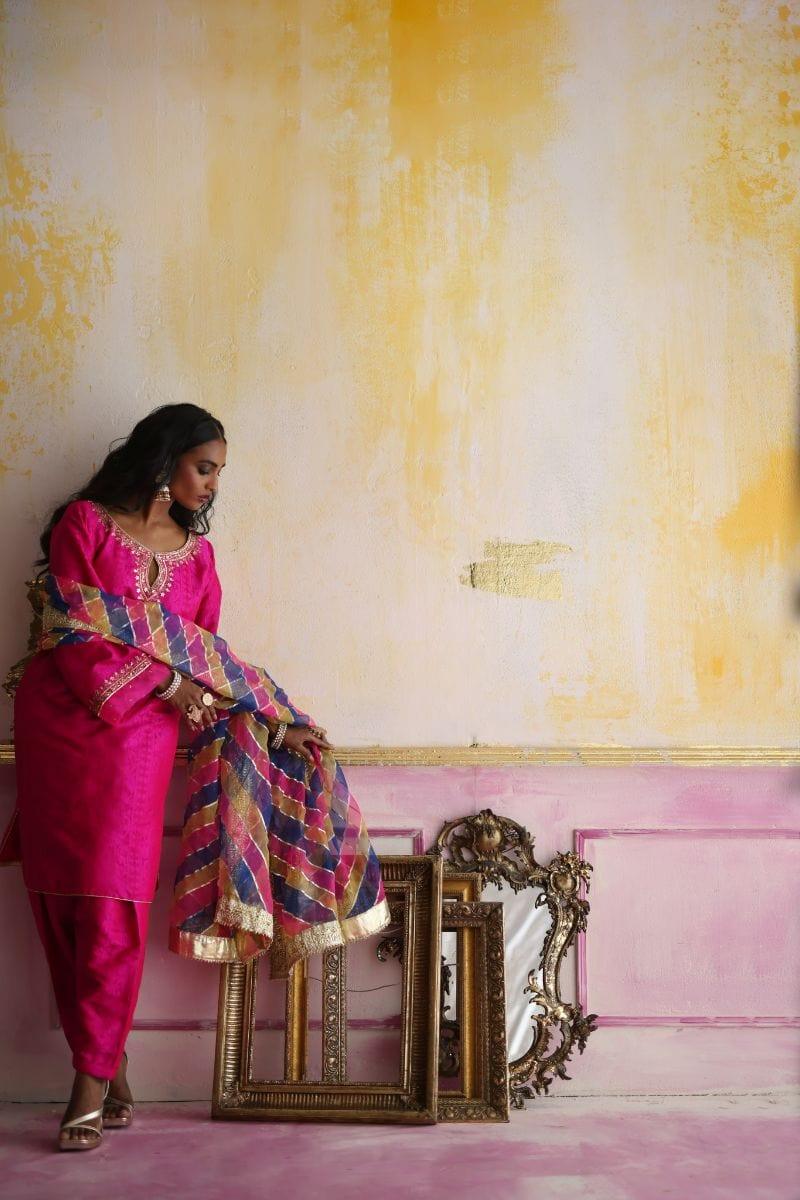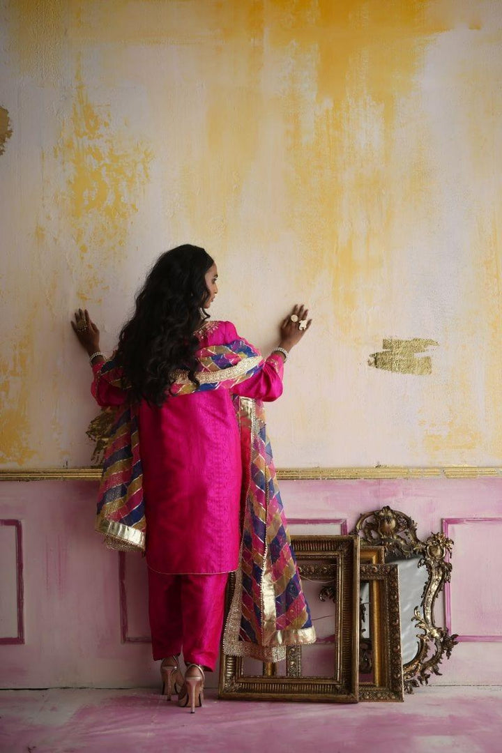 Description: Hot pink phiran self jamawar shirt with sequence and zari work paired with similar fabric shalwar. Dupatta- Lehriya dupatta with dhanak in between colors and finished with gota.