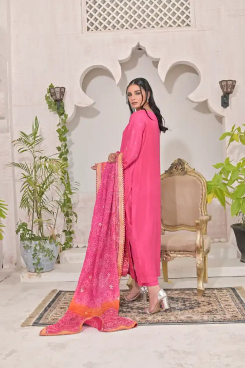 This Pink ensemble is a testament to elegance and expert craftsmanship. The Pure silk long shirt, embellished with intricate handwork, radiates luxury and sophistication. It is paired with Straight Pure silk Pant also heavy gotta work Pure chundri Dupatta. completes the look with a refined touch, perfectly complementing the entire ensemble.