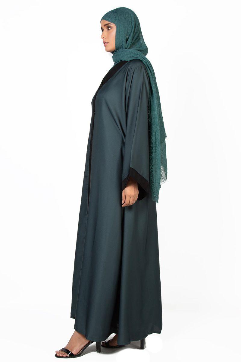 Product Description:  Our beautiful pristine green Abaya features bell sleeves with black buttons and will give you the perfect elegant look you want in Nada fabric!