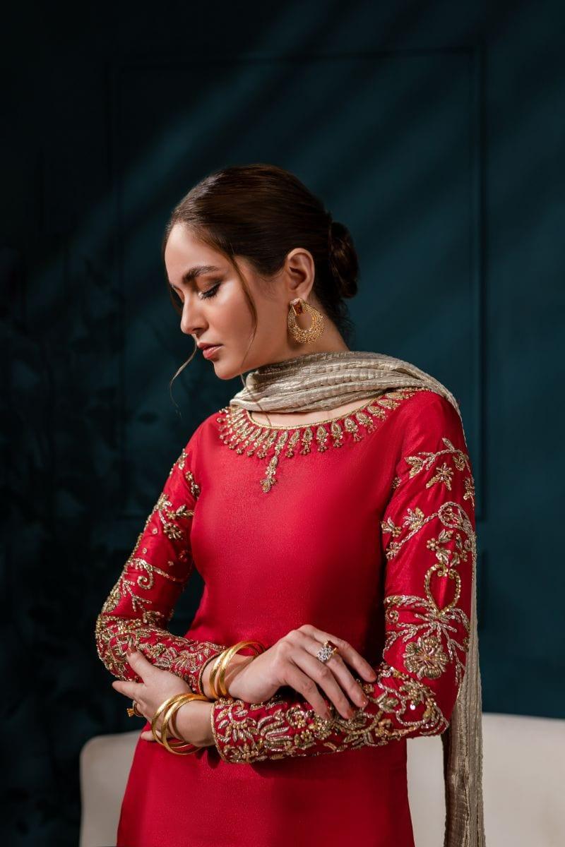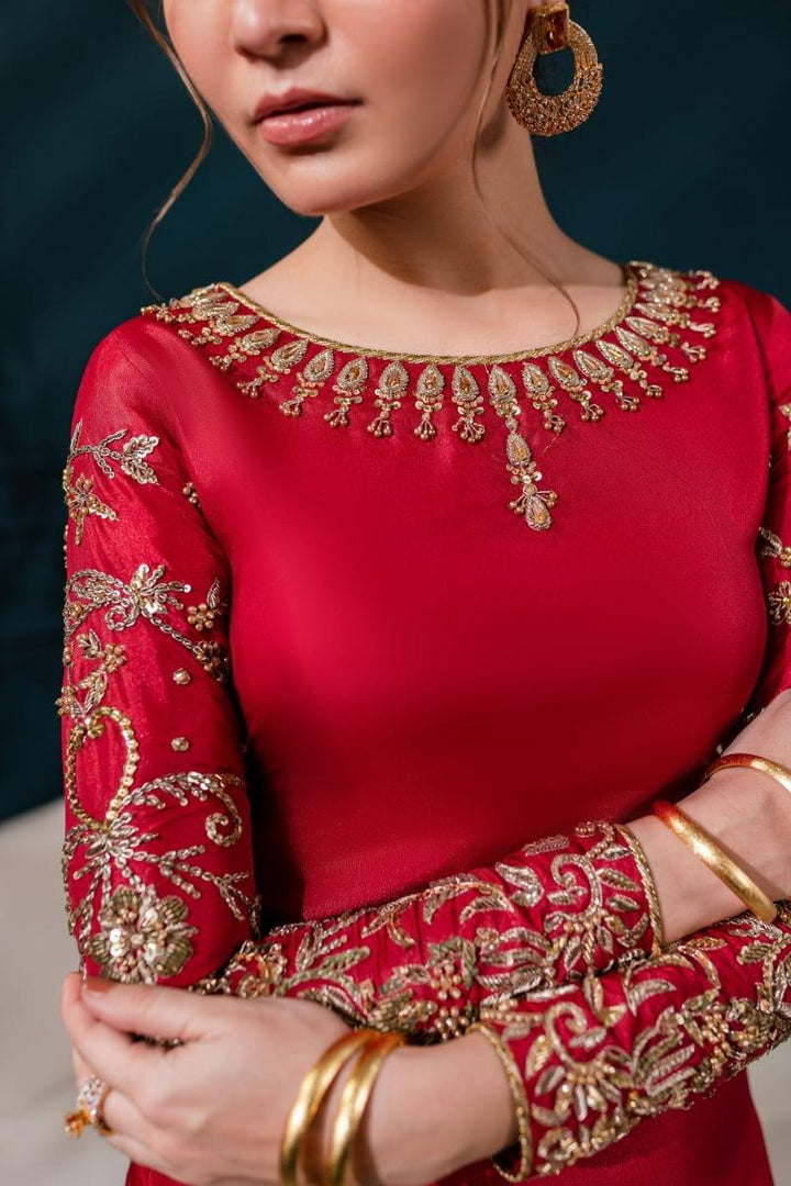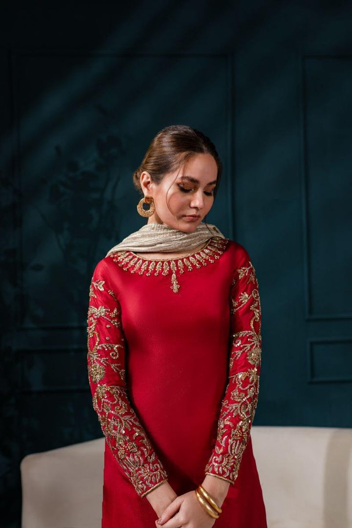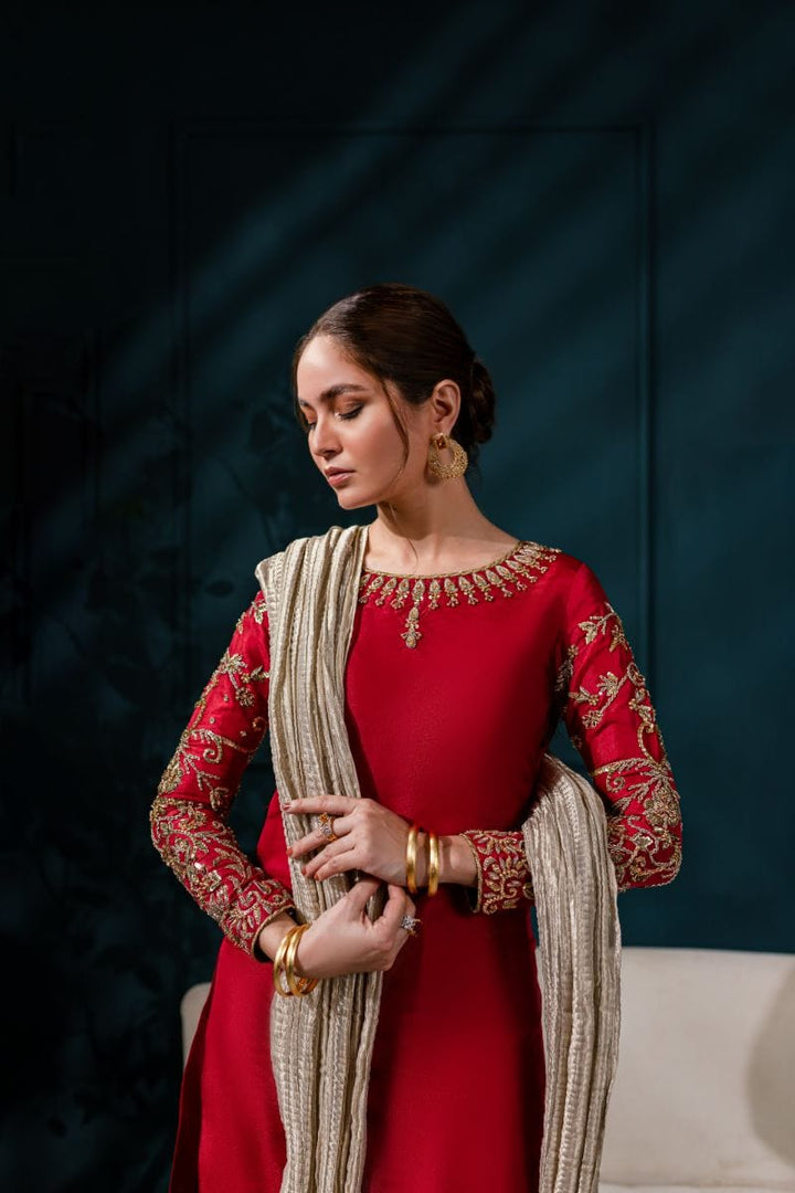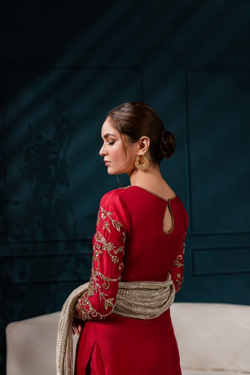 It’s a graceful maroon silk shirt with heavily embellished sleeves. The dainty embellishments are in golden and copper dabka, sitara, cutdana, nakshi and pearls. It comes with a matching silk pants and a gorgeous golden crush dupatta with hand made contrasting tassels