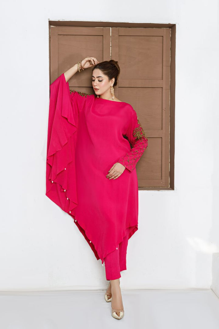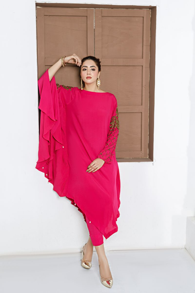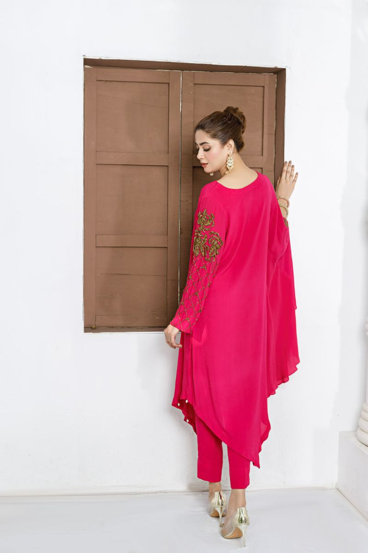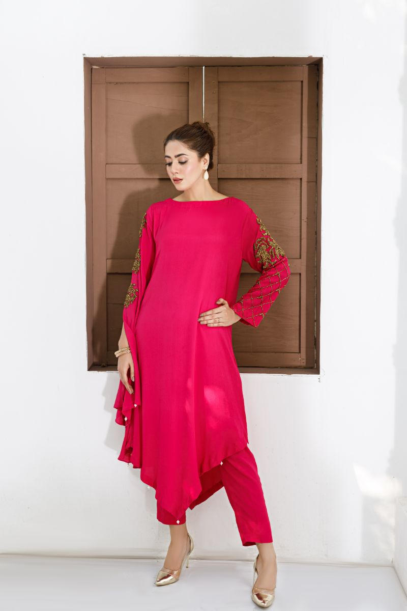 Dazzle in every step as you adorn this fusion grip georgette shirt in hot pink. An interesting fusion cut, the sleeves are intricately hand worked with one side exaggerated, making a bold statement.