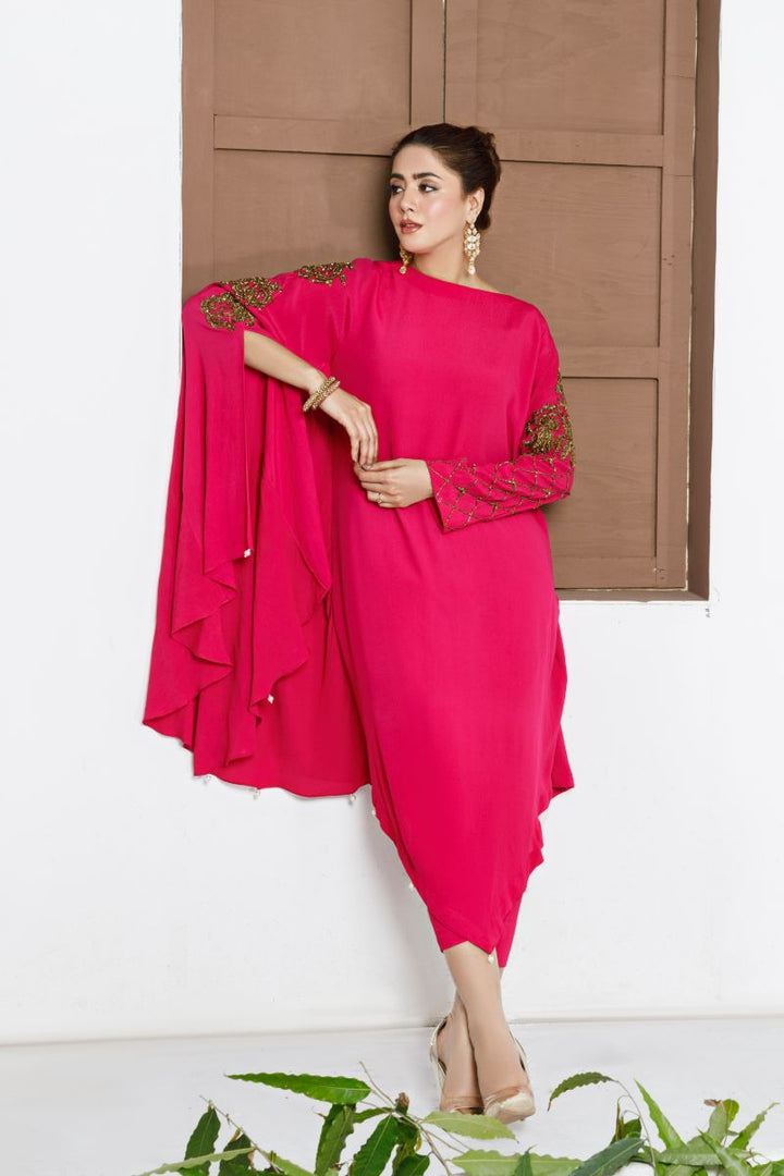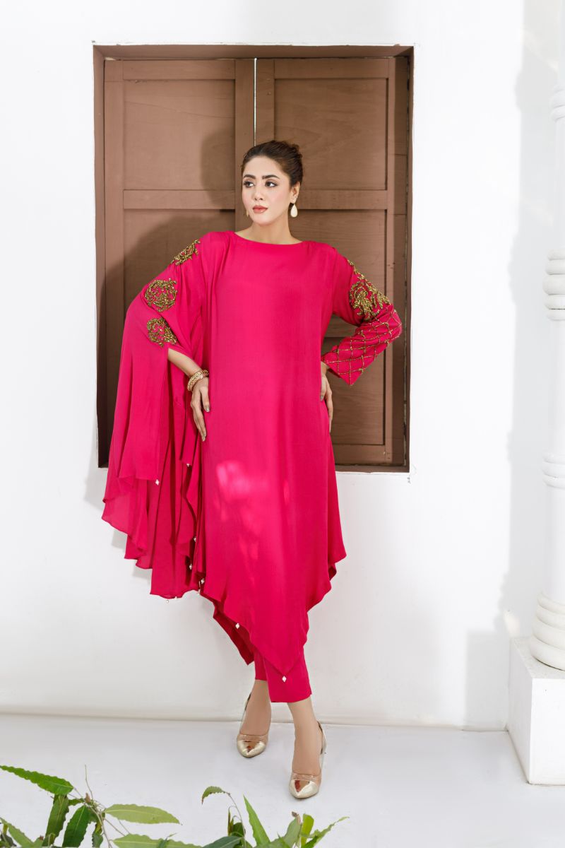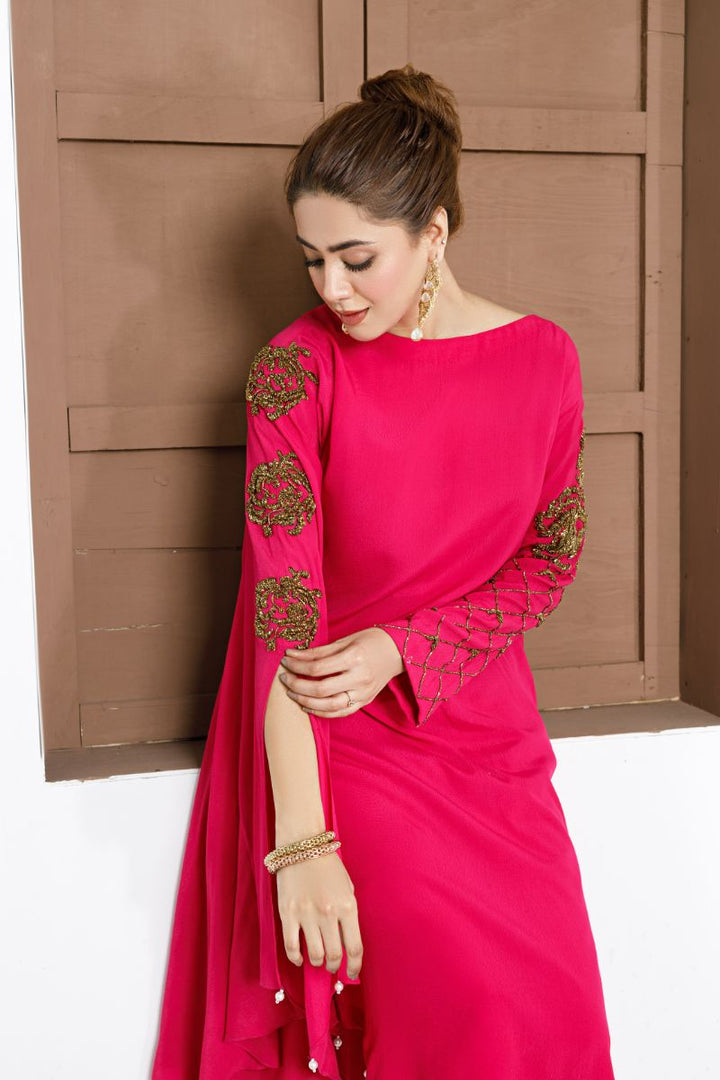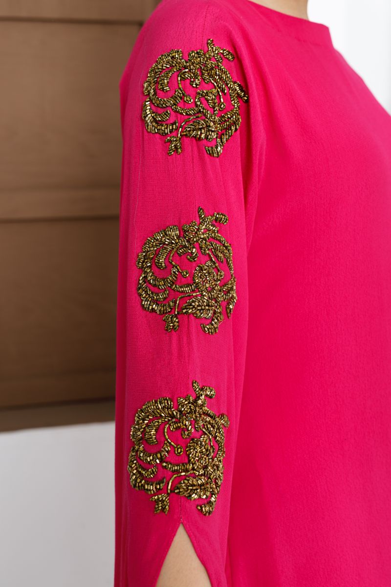 Dazzle in every step as you adorn this fusion grip georgette shirt in hot pink. An interesting fusion cut, the sleeves are intricately hand worked with one side exaggerated, making a bold statement.