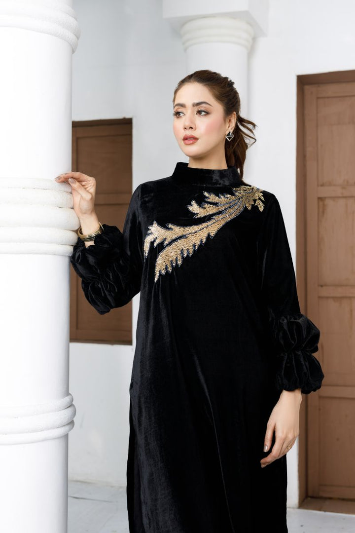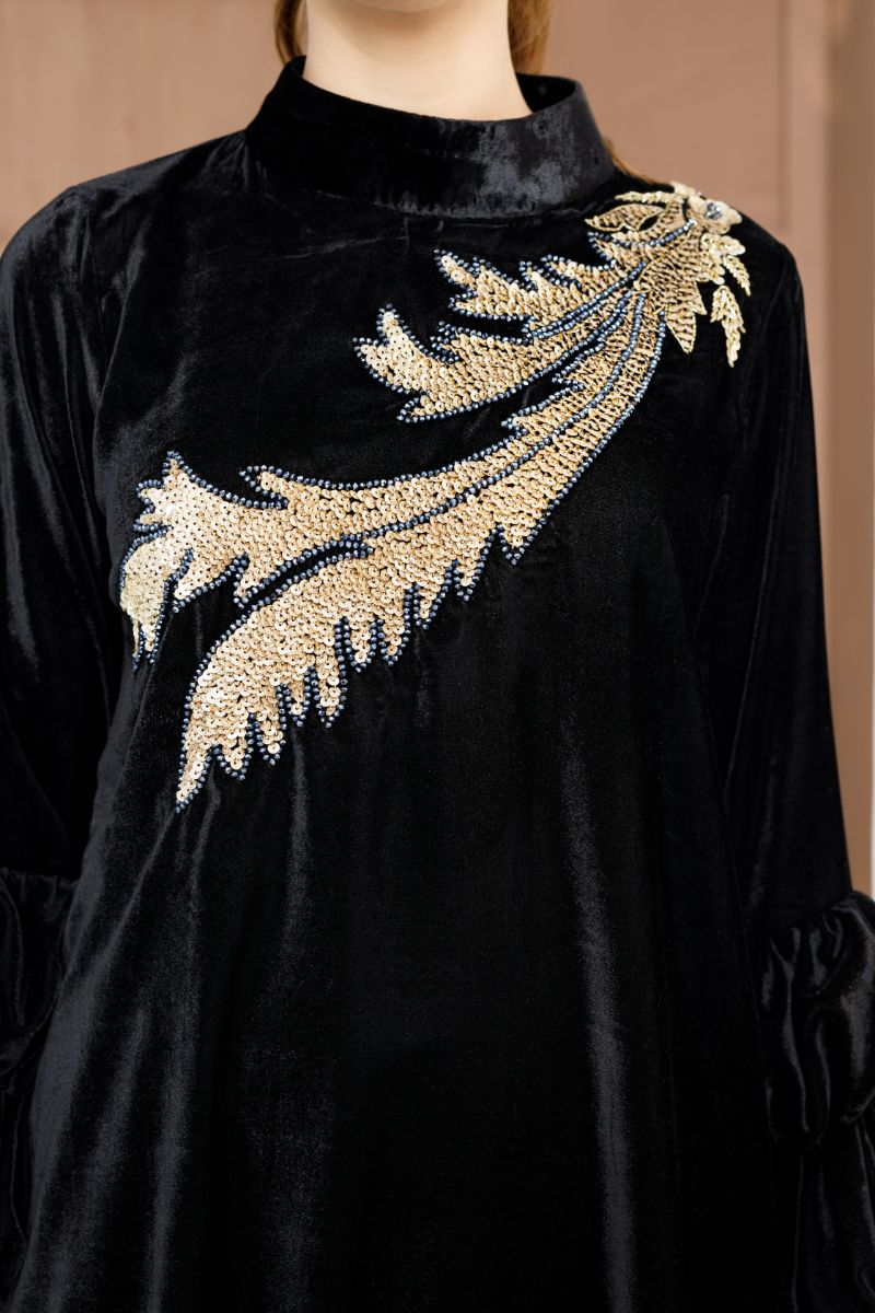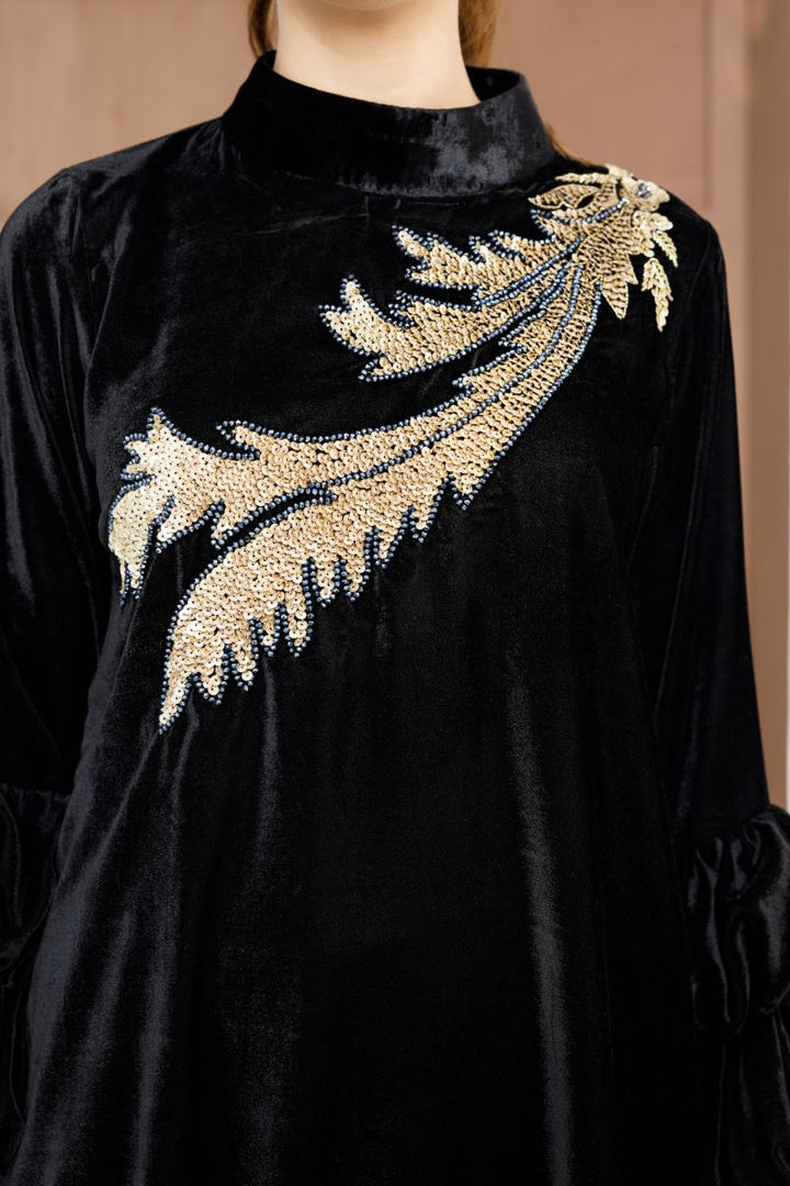 Become a head turner this winter festive season in this stunning black velvet shirt worked upon delicately with gold sequins and stone work.