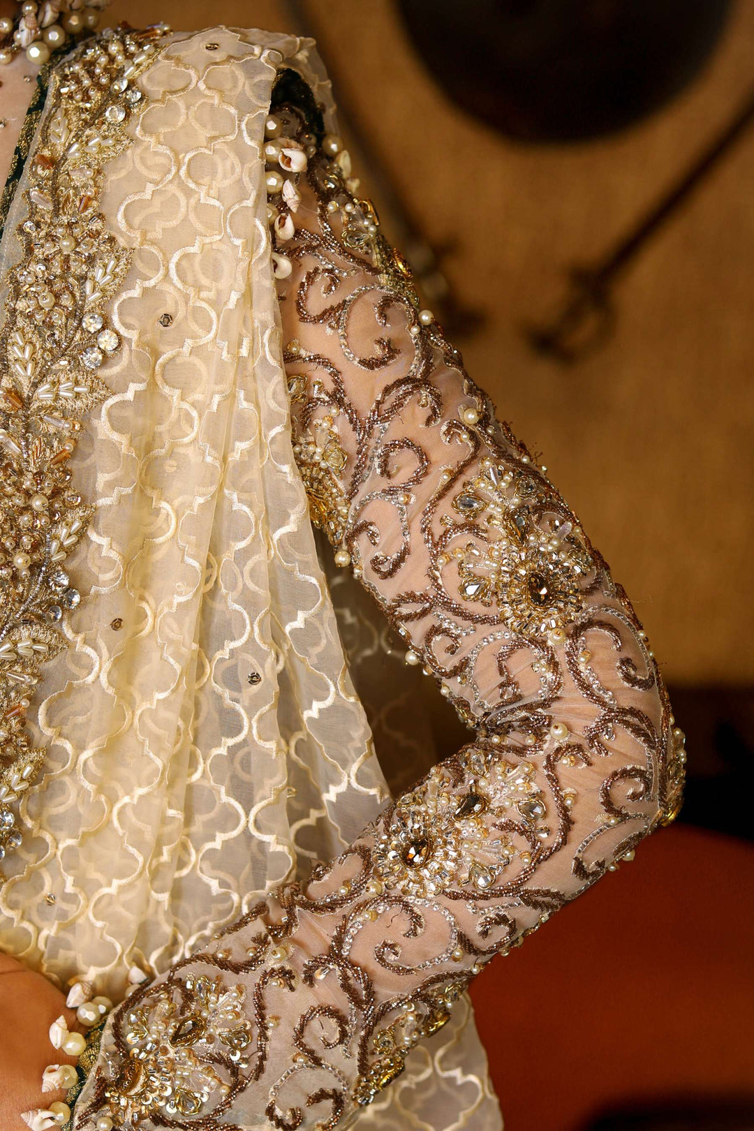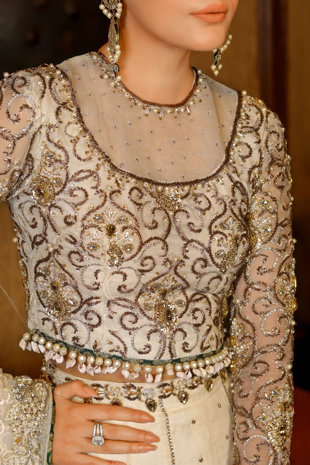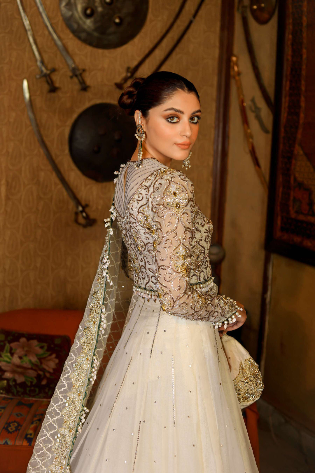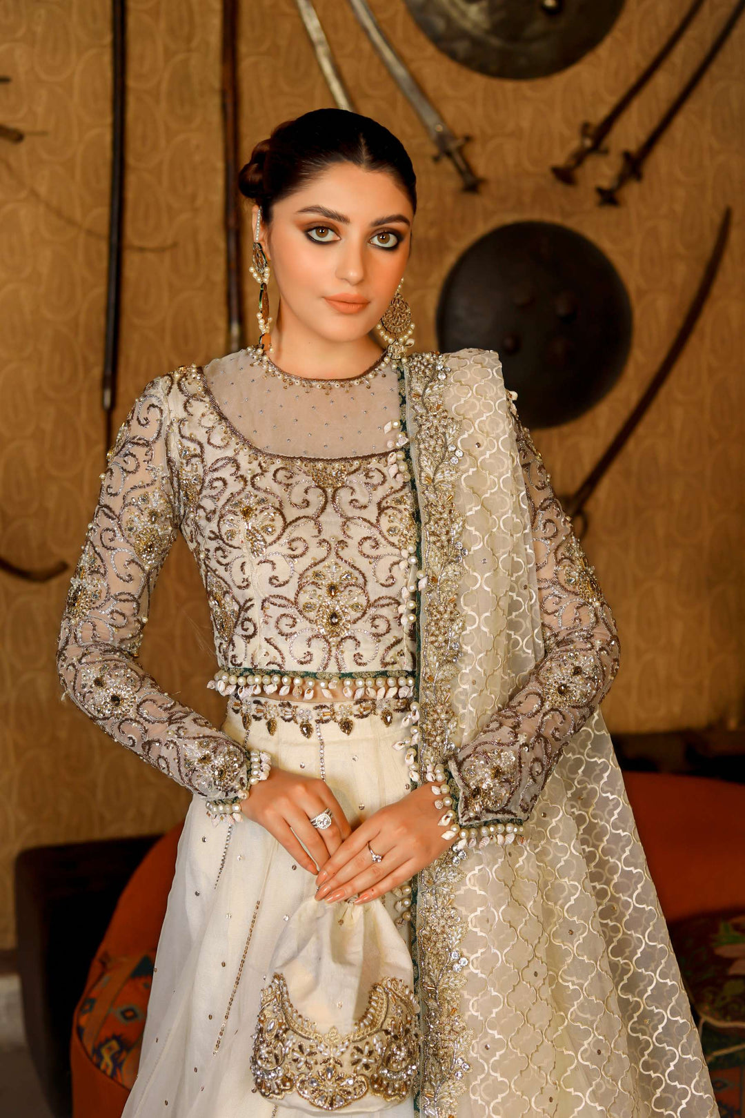 Its a 4 pcs bridal consisting of an organza blouse with sheer upper part and heavily hand embellished details. An organza lehanga with sequins lines and heavy border trim adorned with tilla,kora,dabka,sitara and kundan.it cones with heavy jaal dupatta with heavily embellished border around it trim with hangings.