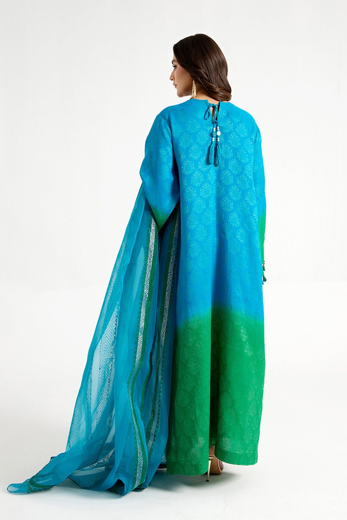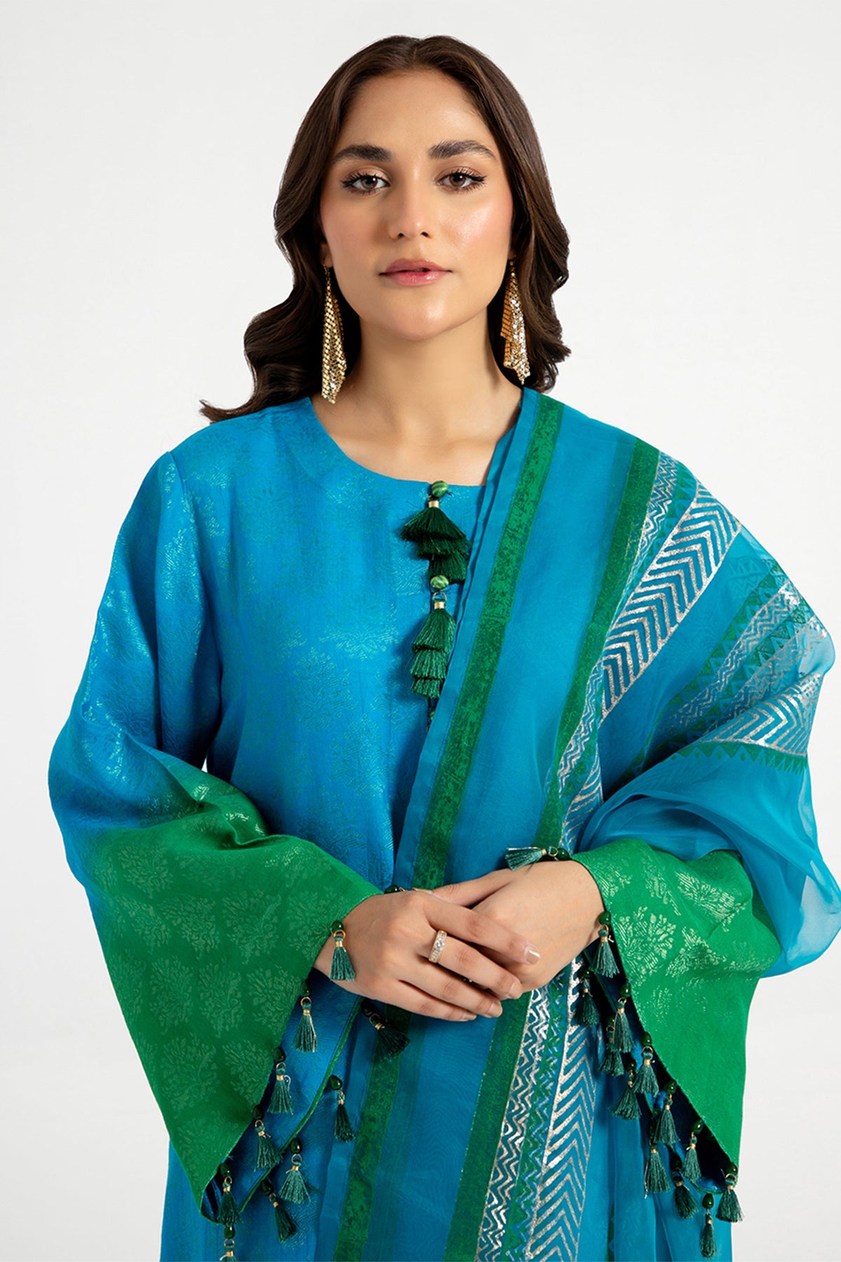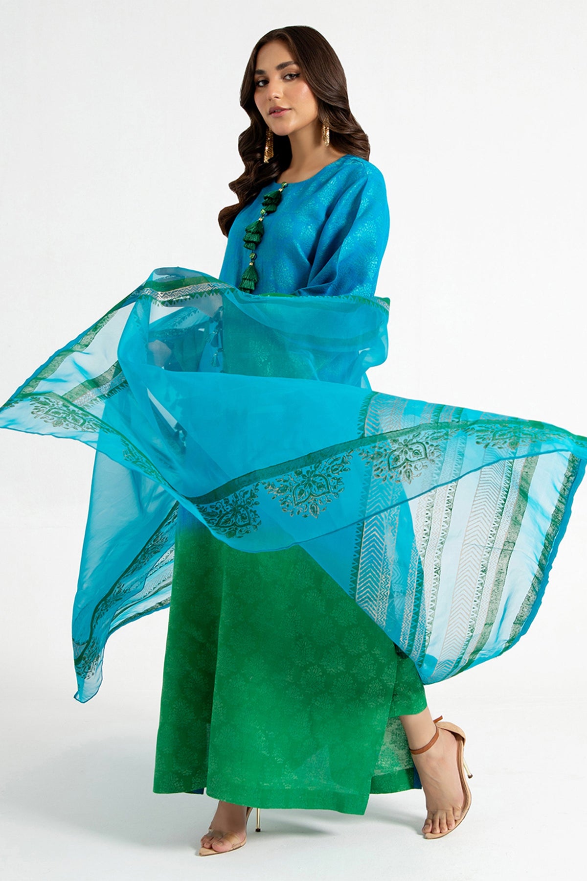 Arif Ashraf - Yasil - Blue and green - Self Jacquard and Organza - 3 Piece