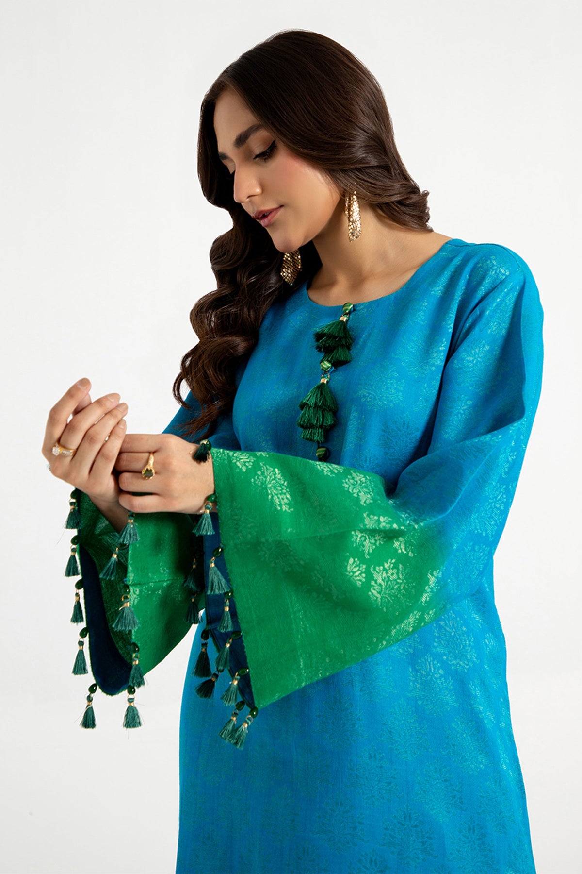 Blue and green gold embose mughal motif jacquard loose fit aline shirt with tussles on the neck and sleeves hem.