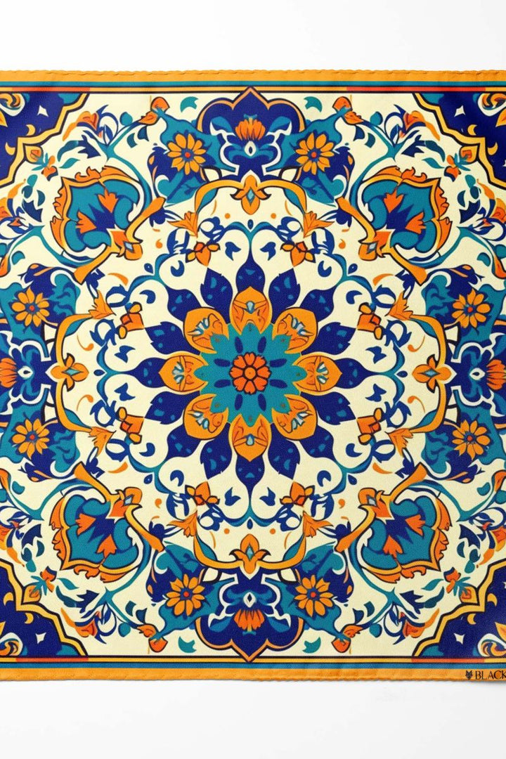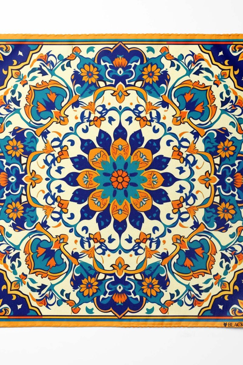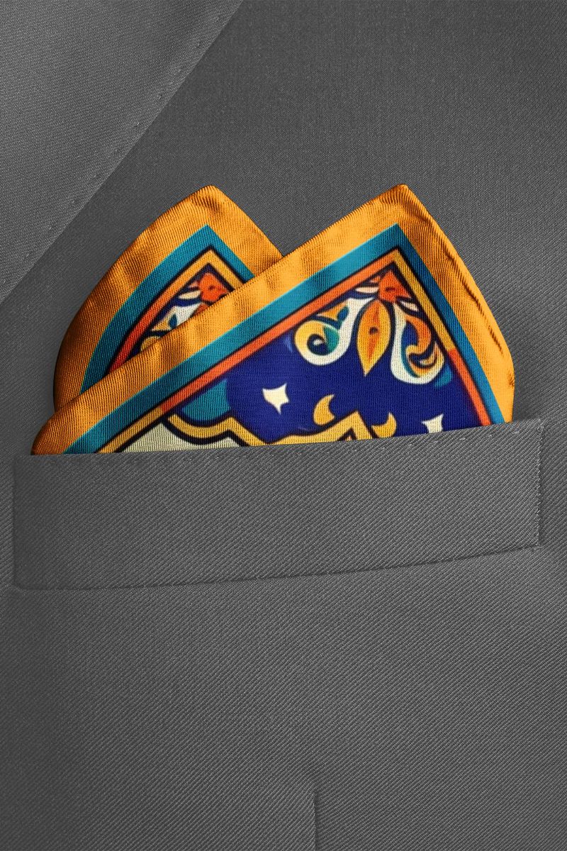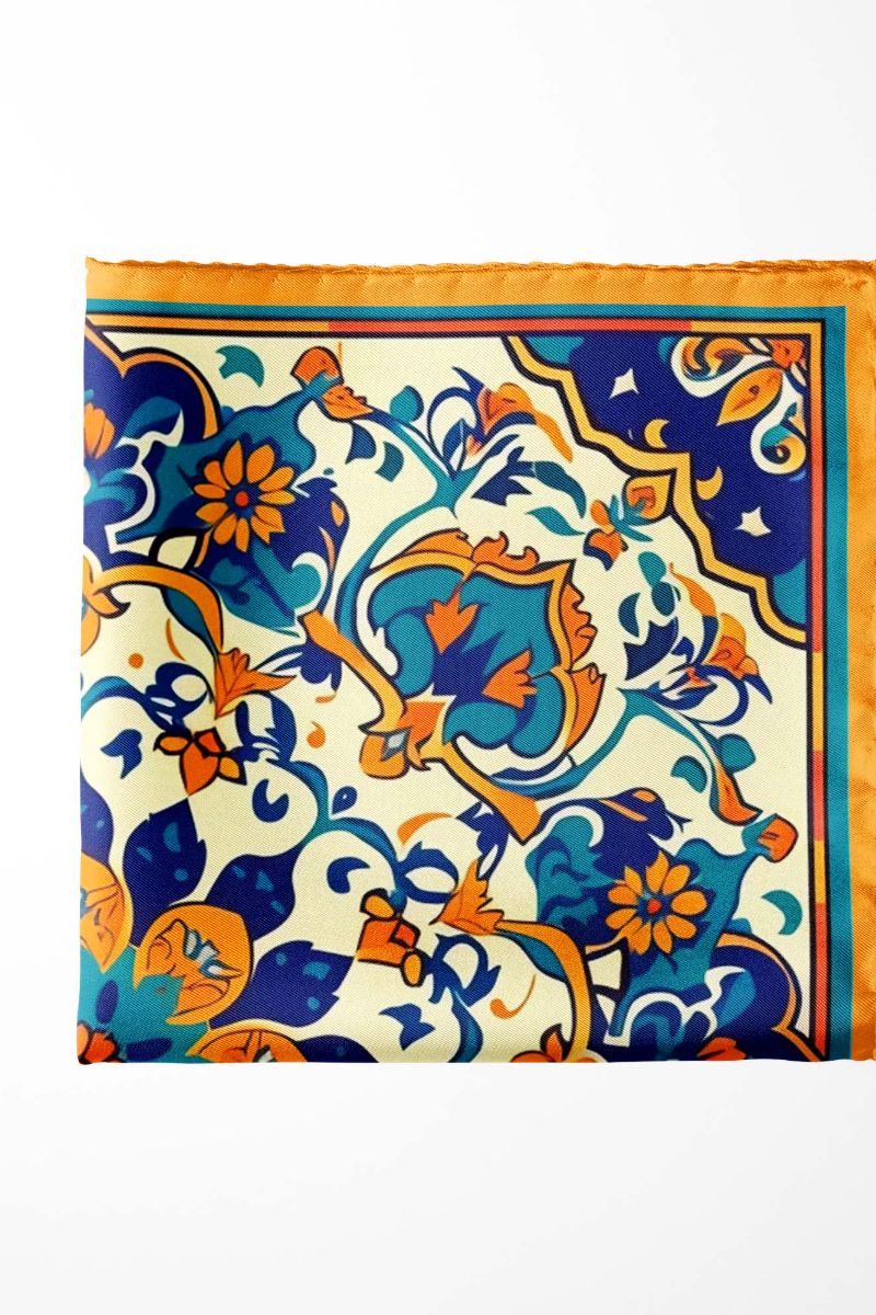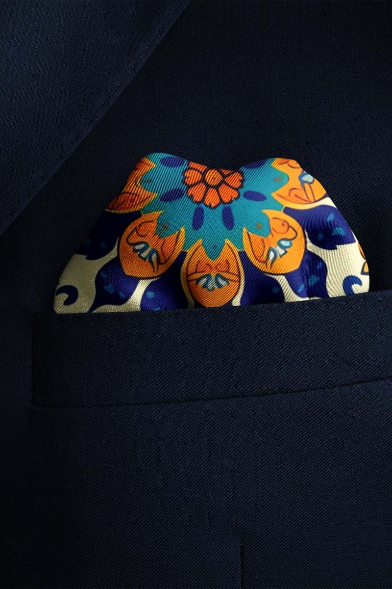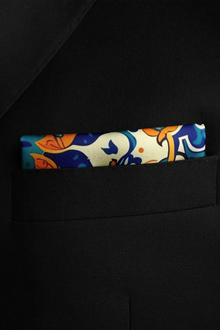 Sophisticated pocket square features a central floral design in vibrant shades of blue, orange, and green, with a rich blue and orange border. It is inspired by traditional motifs, and exudes an aura of refined elegance and adaptability.
