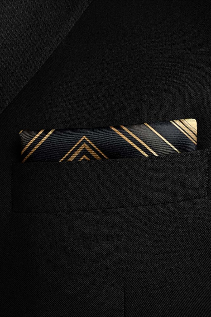 Elegant pocket square featuring a geometric design with repeating diamond shapes in gold, bronze, and black tones....