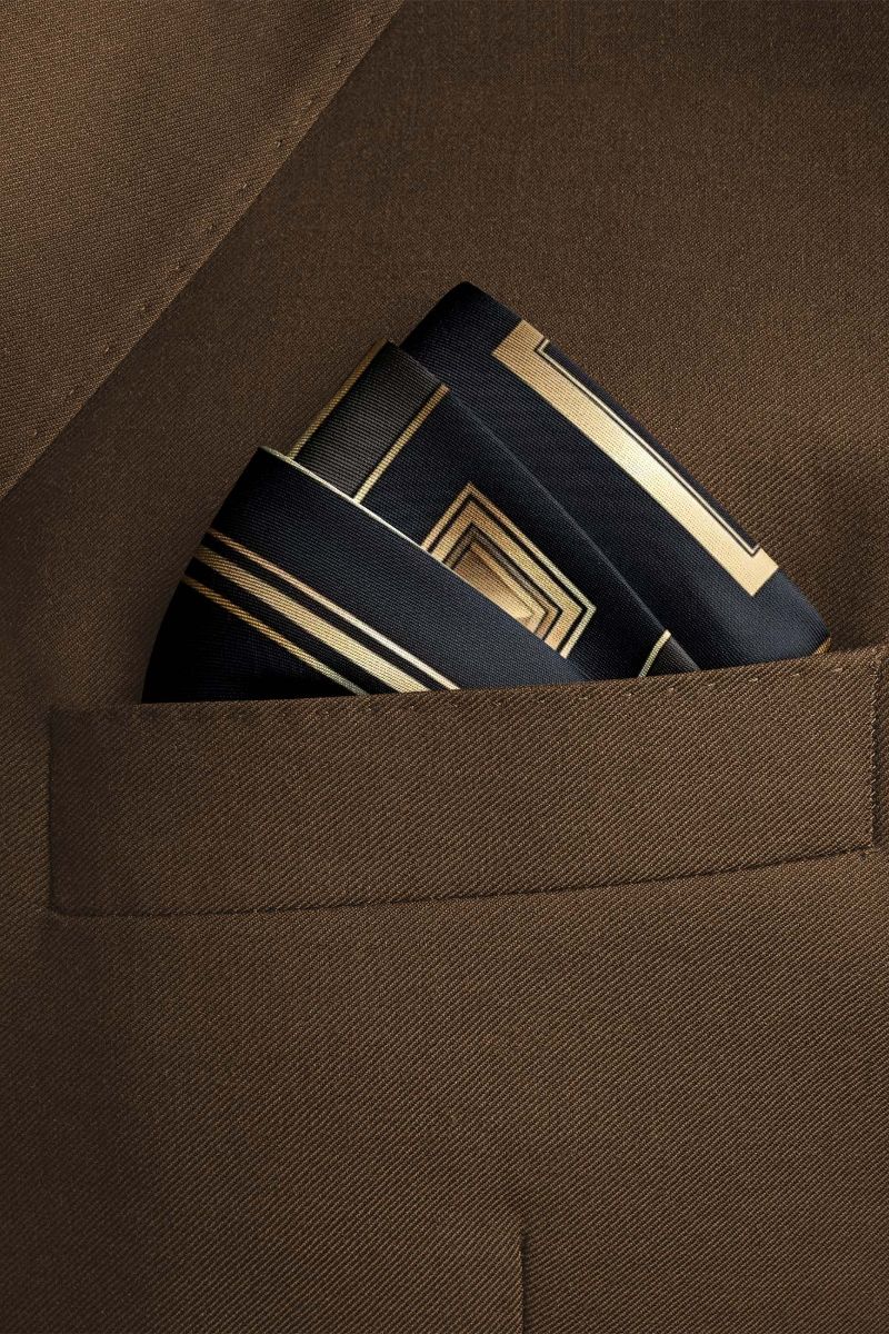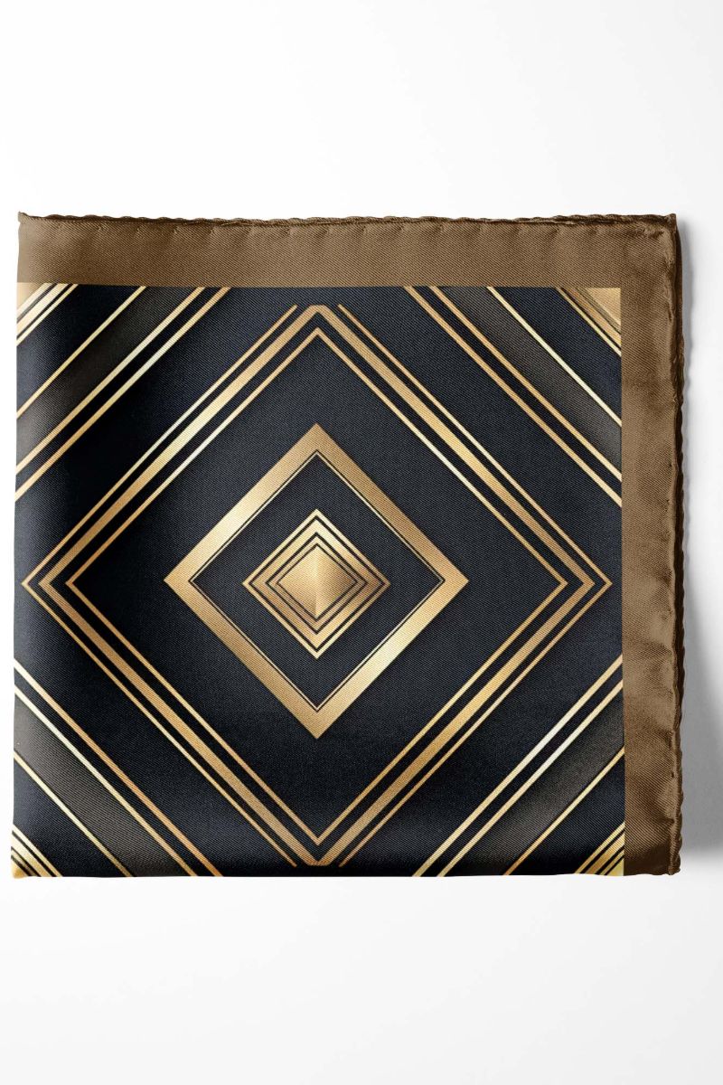 Elegant pocket square featuring a geometric design with repeating diamond shapes in gold, bronze, and black tones. Framed by a brown border, radiates both elegance and adaptability.