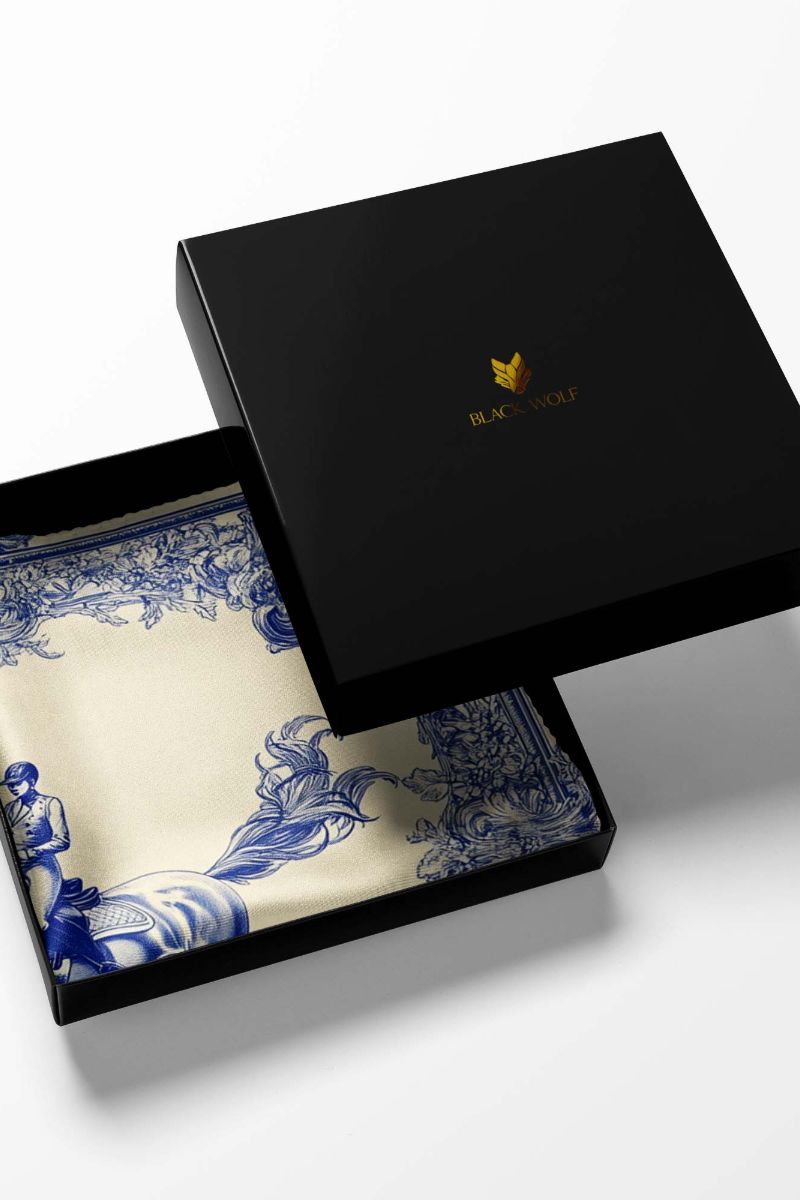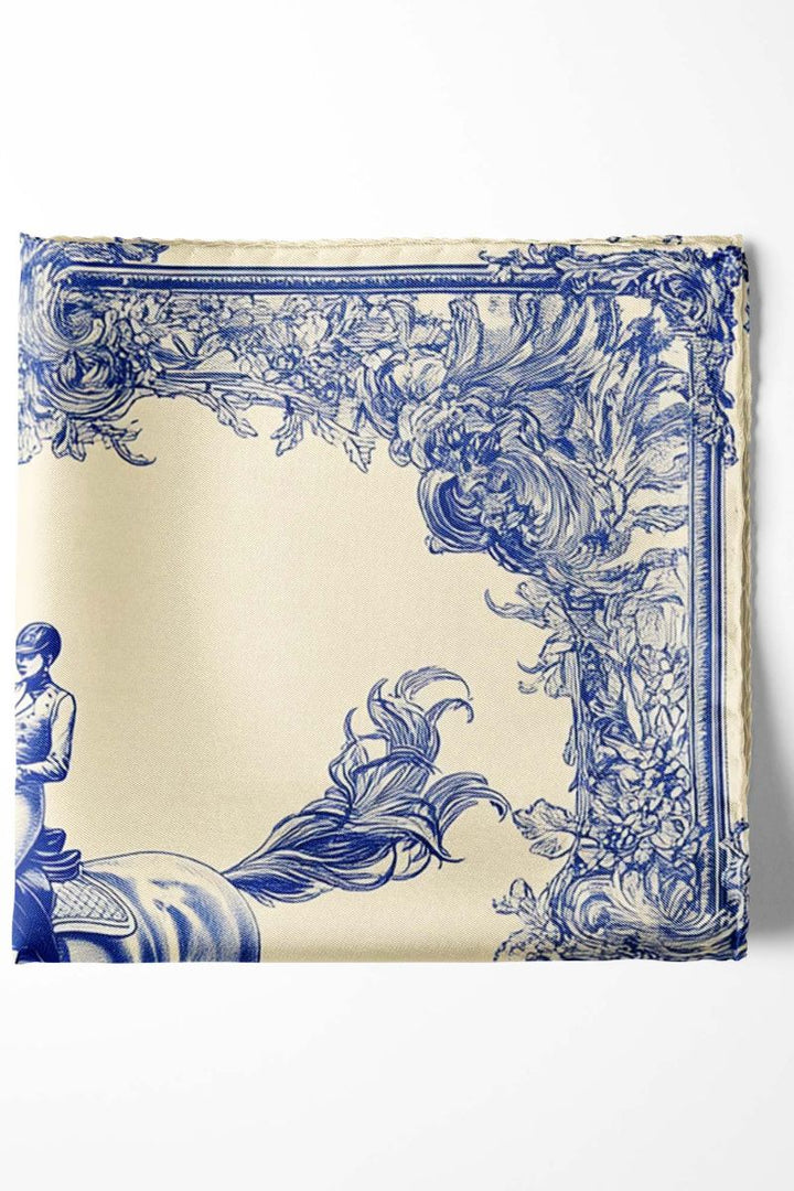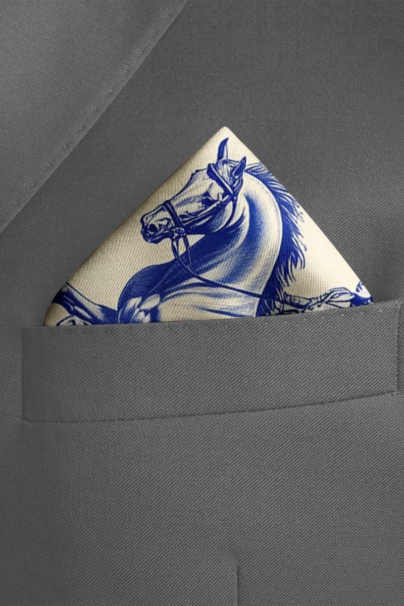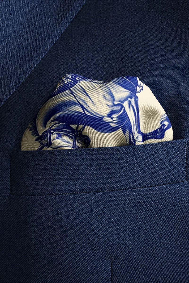 Sophisticated pocket square featuring a rider on a horse in rich hues of blue on a crisp white background, exuding refinement and versatility, perfect for enhancing men's suits.