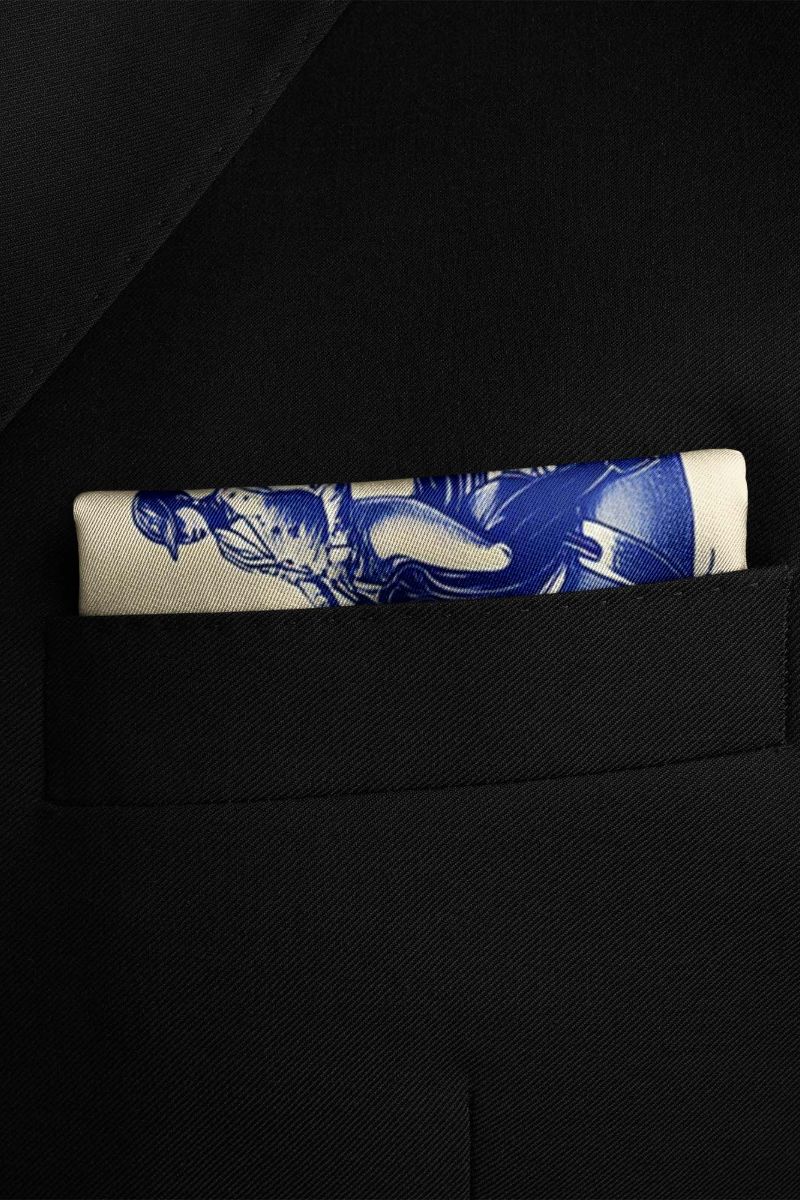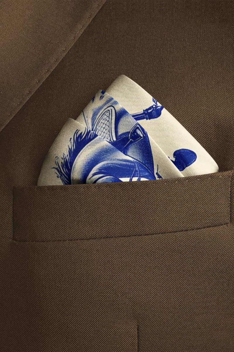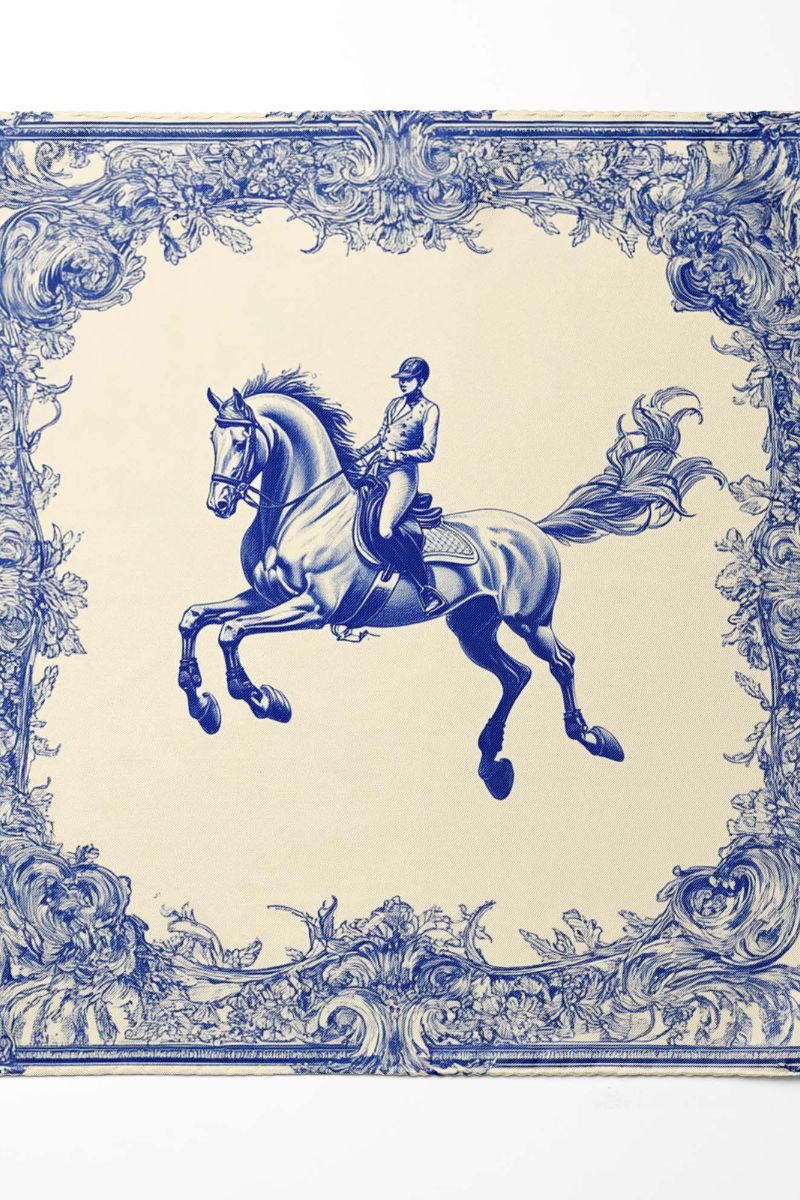 Sophisticated pocket square featuring a rider on a horse in rich hues of blue on a crisp white background, exuding refinement and versatility, perfect for enhancing men's suits.