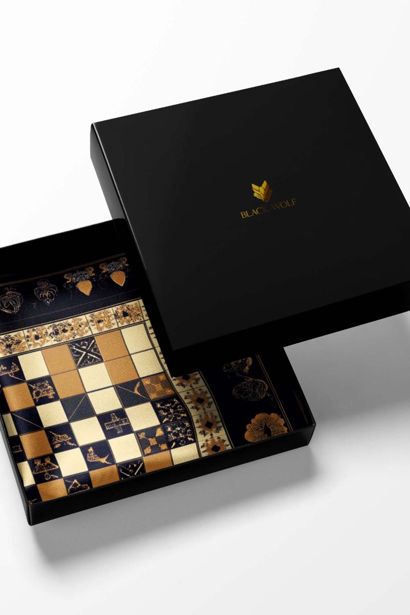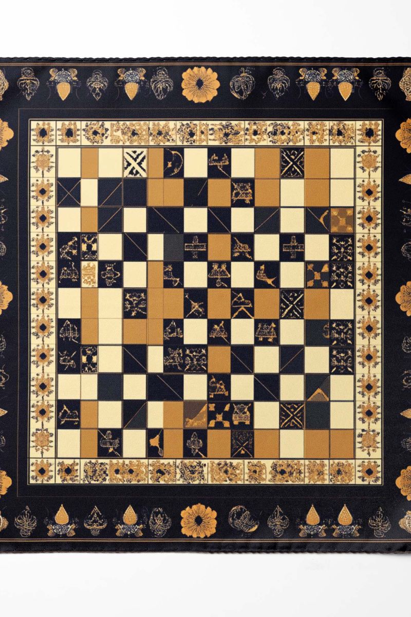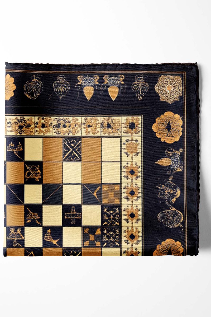 Elegant pocket square, featuring a checkerboard pattern in cream, gold, and black, adorned with unique geometric and floral designs. The piece is framed by a wide black border with intricate floral and fruit motifs, exuding refinement and versatility.